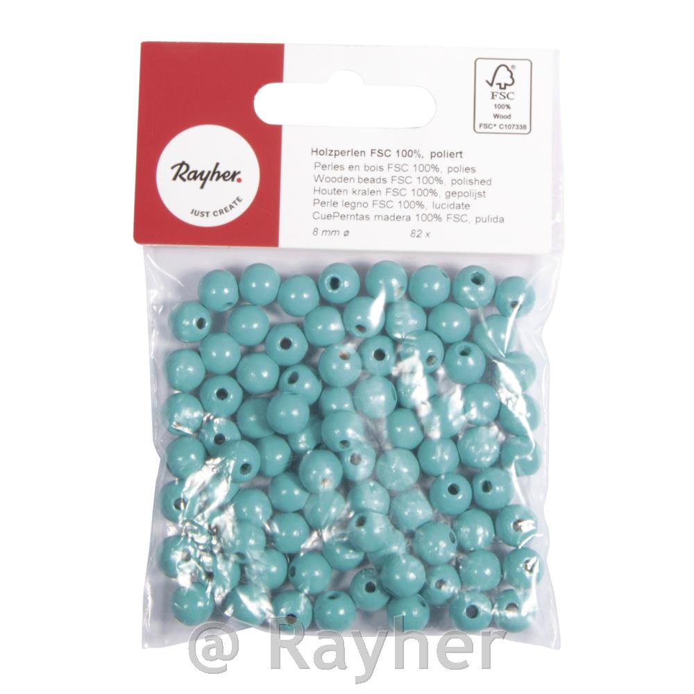 Lesene perle, lakirane, enostavne za nizanje na vrvice, premer luknje približno 2,2 mm. Narejene so iz bukovega lesa, v Nemčiji, imajo certifikat FSC ( odgovorno gospodarjenja z gozdovi). Lesene perle so odporne proti slini in znoju.