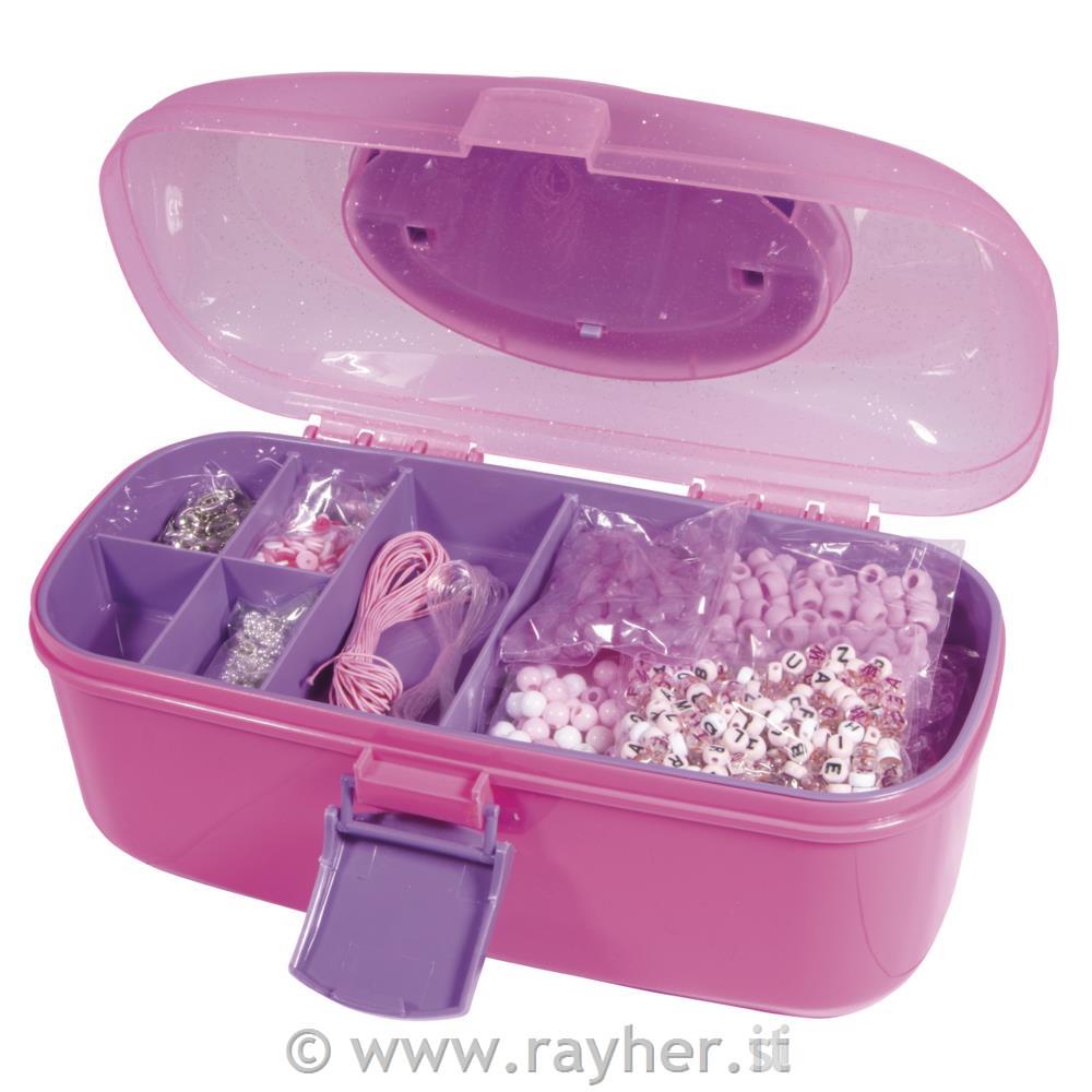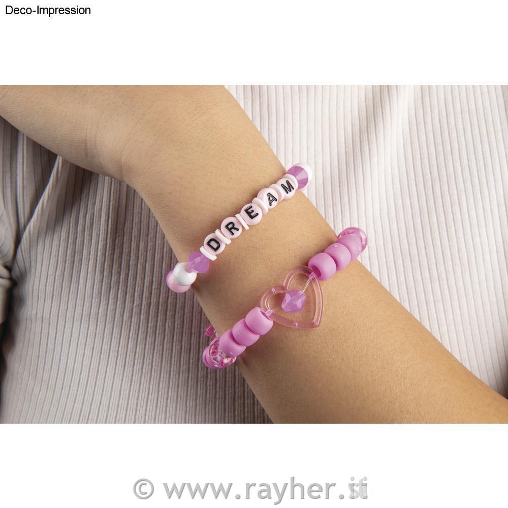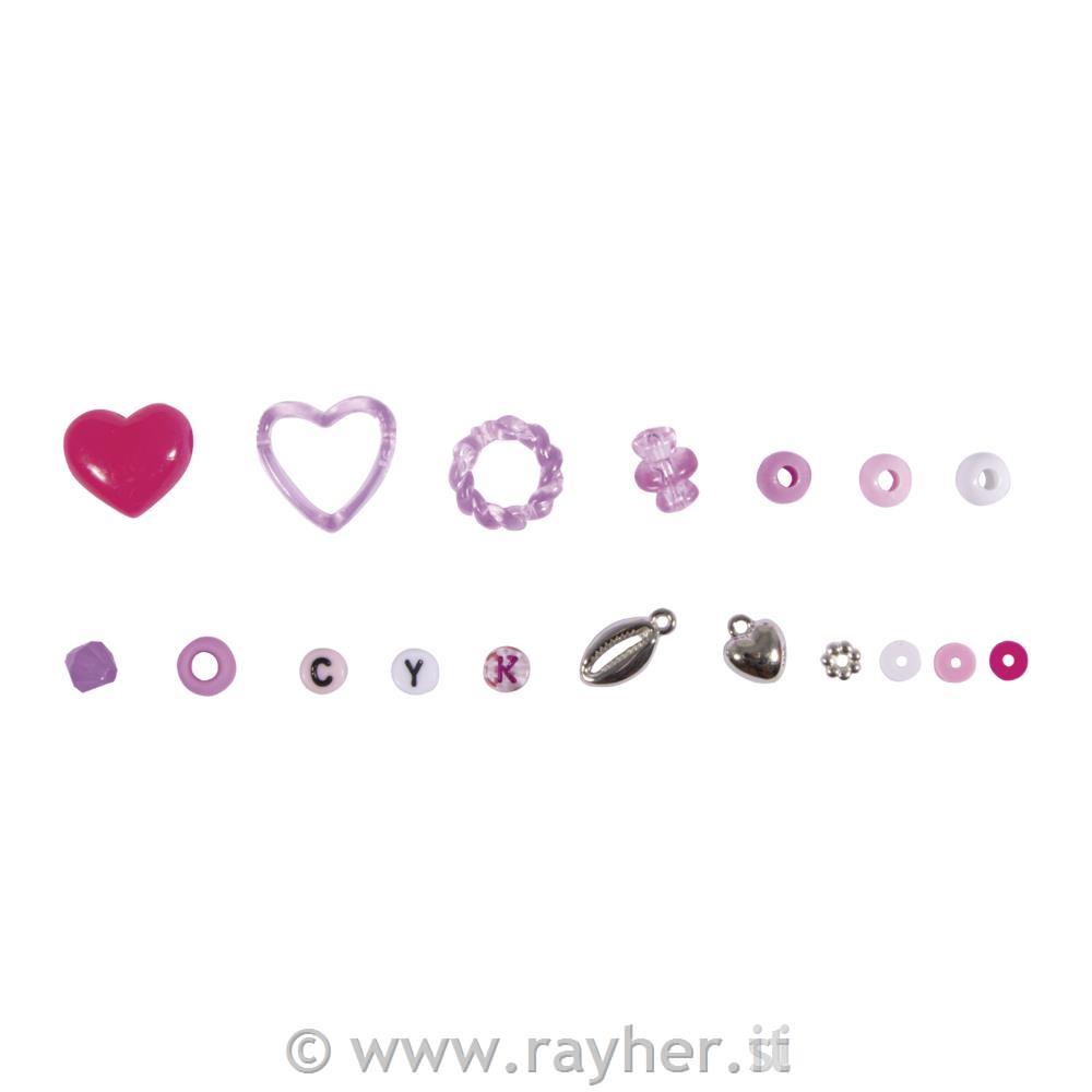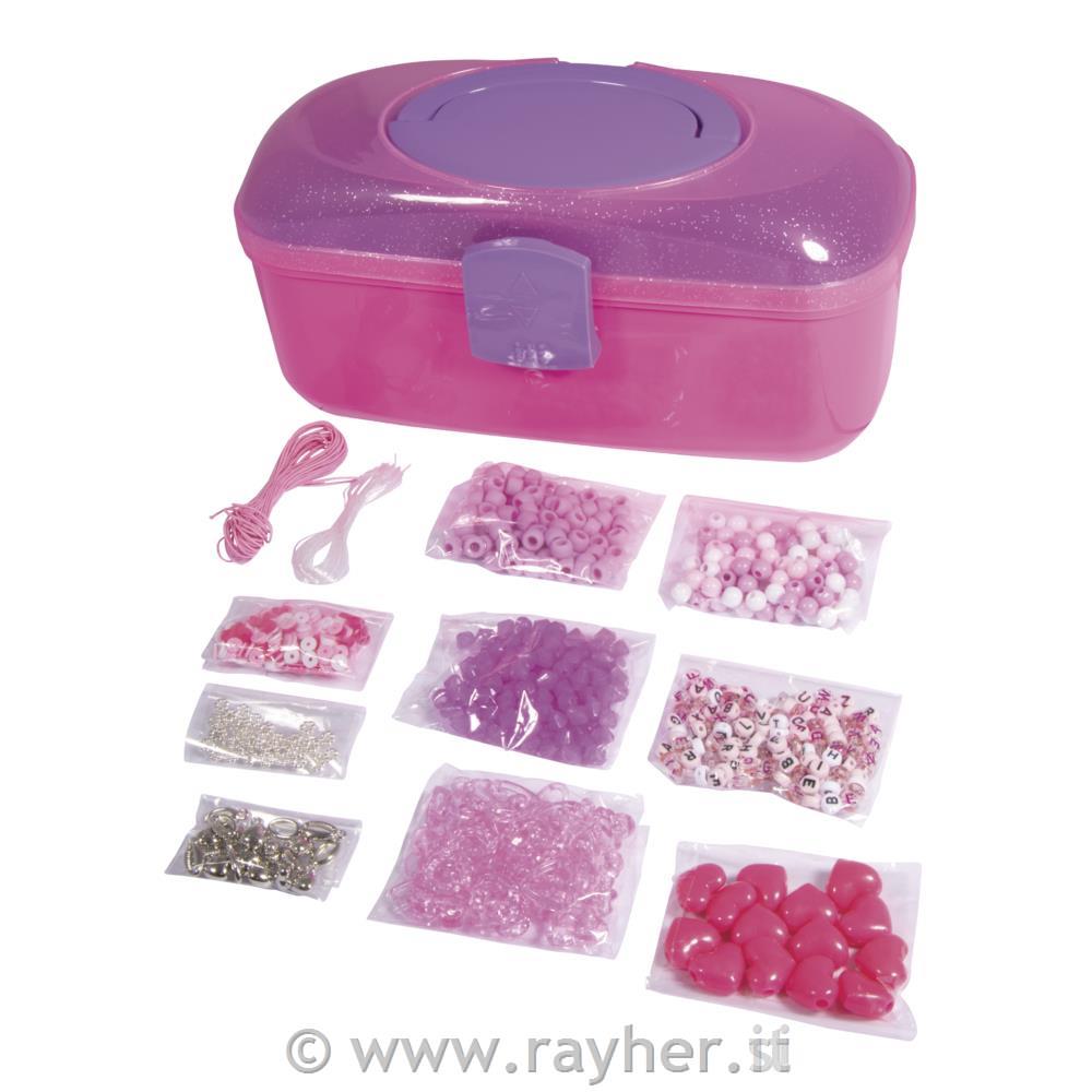 Ta veliki set za izdelavo nakita otrokom prinaša veliko ustvarjalnega veselja. Plastične perle v rožnatih, močno roza in srebrnih odtenkih ter z lepimi motivi spodbujajo ustvarjalnost. Odlični so za izdelavo svetlih ogrlic, zapestnic in še mnogo več.