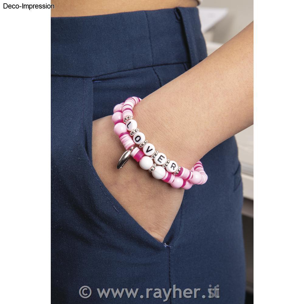Plastične kroglice so v različnih barvah, kot so roza, močno roza in srebrna, ter v različnih oblikah, kot so cvetovi, srca, s črkami, fasetirane, Heishi perlice itd.