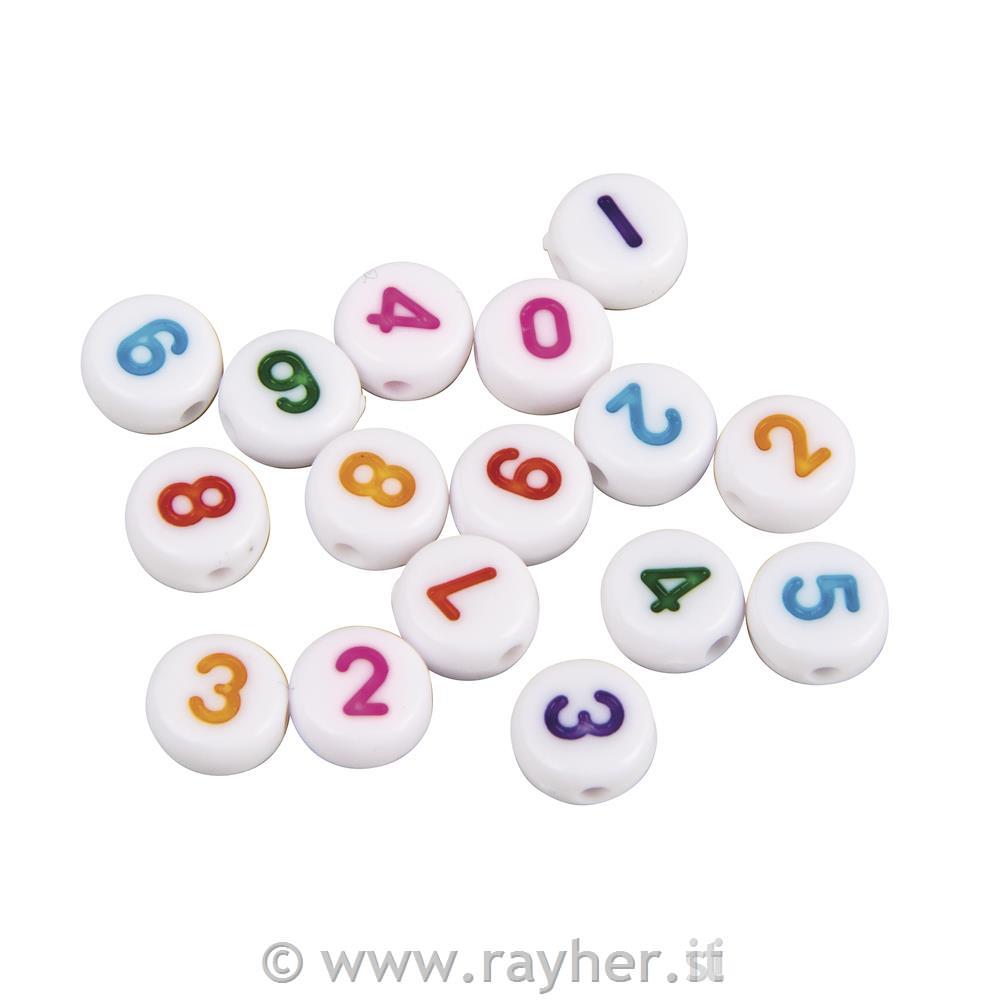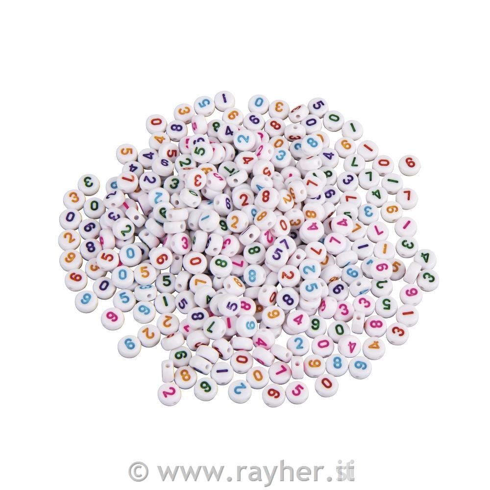 Bele, okrogle plastične številčne kroglice imajo premer 6 mm, luknja za navlekanje pa ima premer približno 1 mm. Vrečka z mešanico številk 40 g (približno 400 kosov).