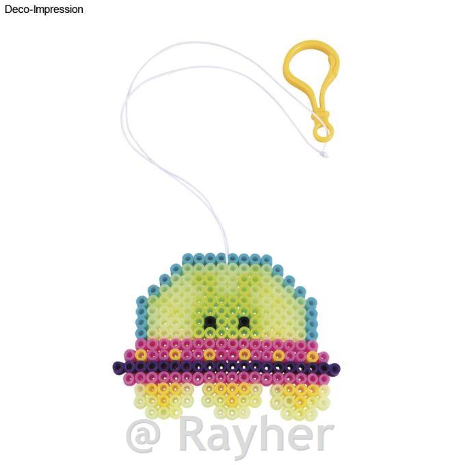 posiziona le perline a fusione secondo il modello sulla basetta forata. Una volta che il motivo e pieno di perline, posiziona la carta da stiro sopra e salda le perline passandoci sopra il ferro da stiro (impostazione 2) con piccoli movimenti circolari. Lascia raffreddare e rimuovi con attenzione il motivo dalla base forata. Quindi fissa il gancio di sospensione.