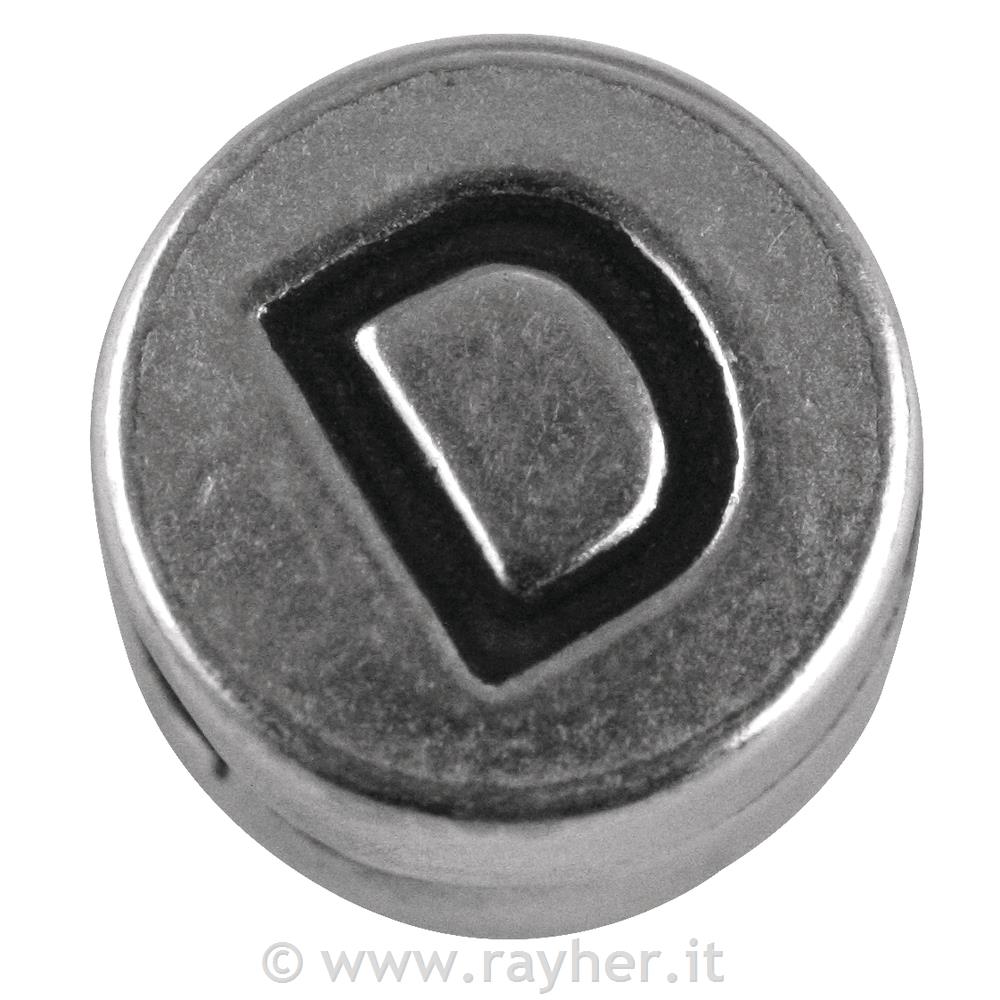 Perla metallo "D", 7mm o, argento, foro 2mm o, sfuso