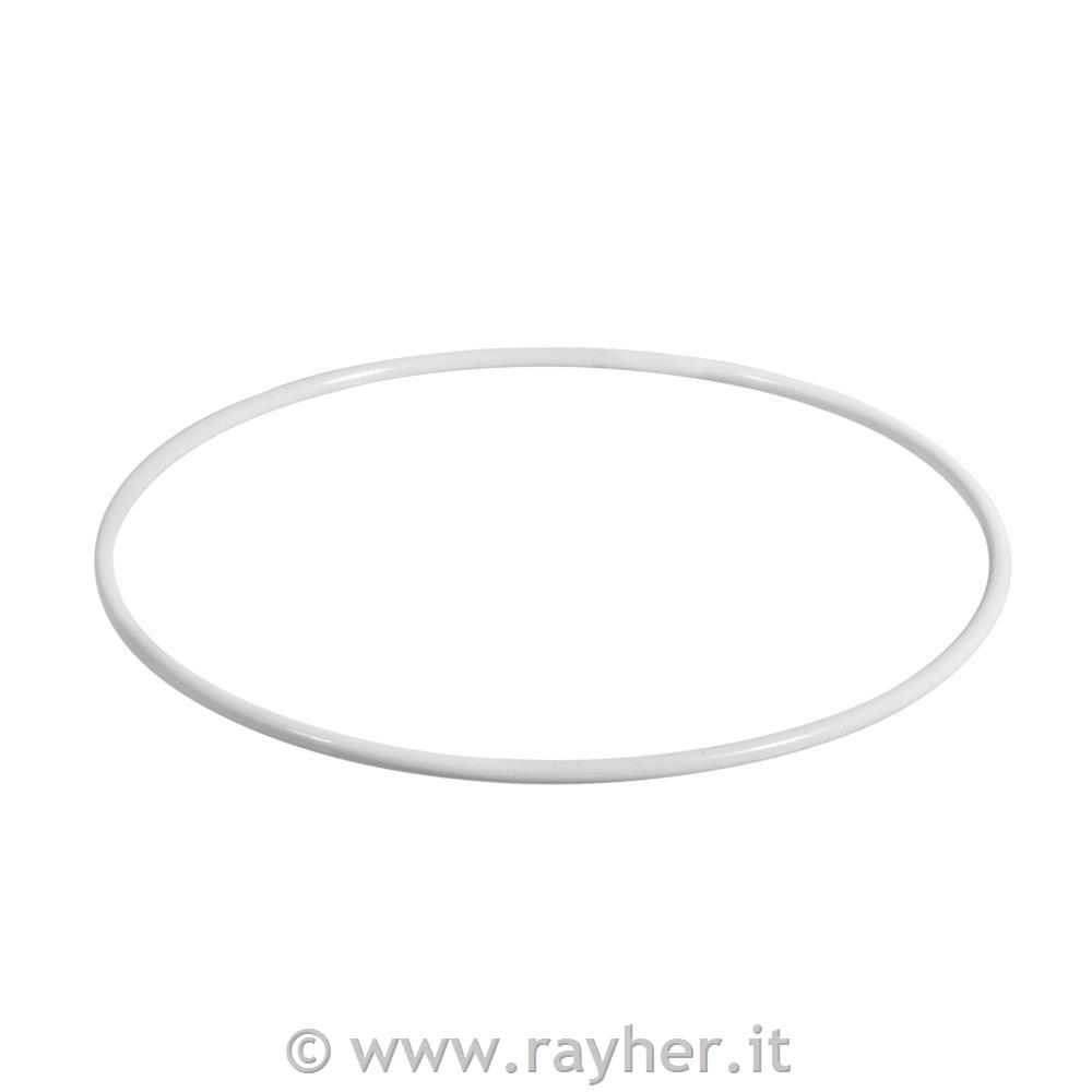 Bel prevlečen kovinski obroč premera 15 cm, izdelan iz železne žice, debelina žice približno 3 mm.