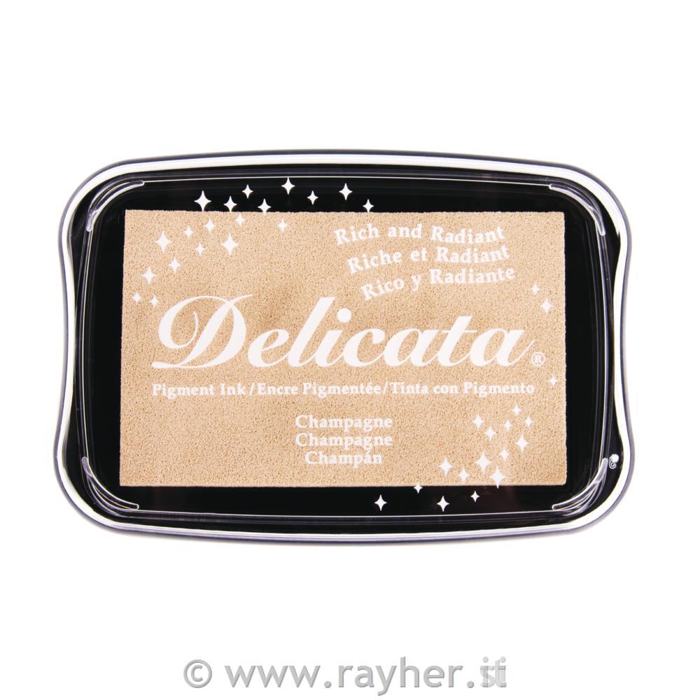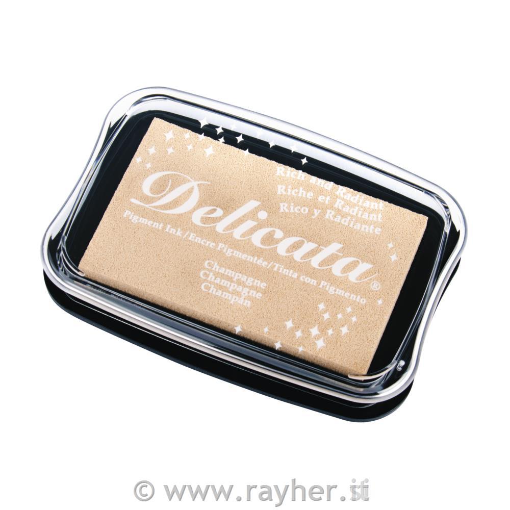 Tsukineko Delicata pigmentna blazinica z izjemno kovinsko barvo, ki ne zbledi in ne izgubil leska. Hitro se posuši na poroznih papirjih in naredijo čudovit efekt na različnih barvnih papirjih ali katronih. Odlične so tudi za šabloniranje na papirju. Niso primerne za tekstil.