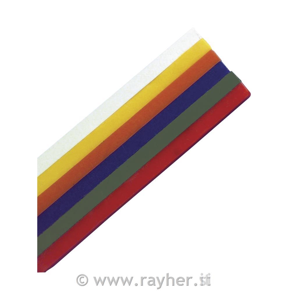 Komplet vsebuje 6 palčk, vsaka meri 3x6 cm in je debela 1 cm, v oranžni, modri, zeleni, rdeči, rumeni in beli barvi. Preprosto odrežite potrebno količino. Vosek je zelo gladek, za gnetenje pa zadostuje toplota rok. Idealen je tudi za okraševanje nelakiranih sveč.