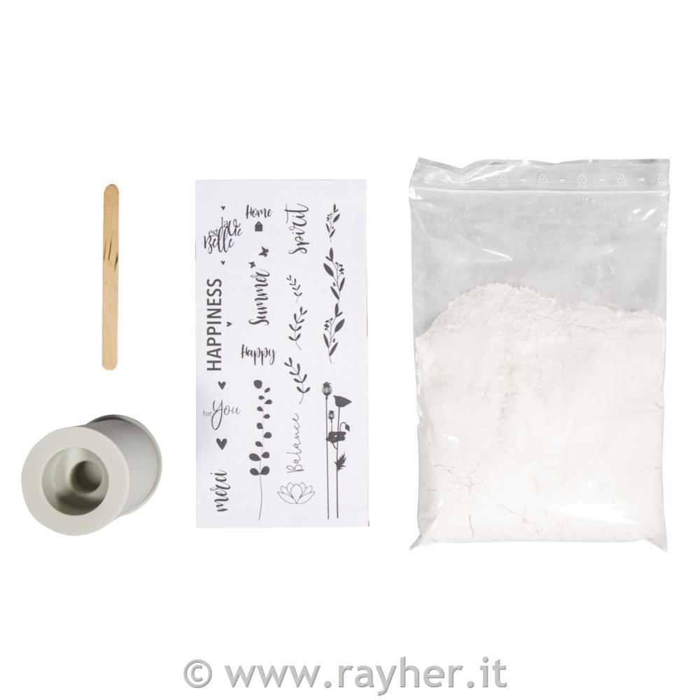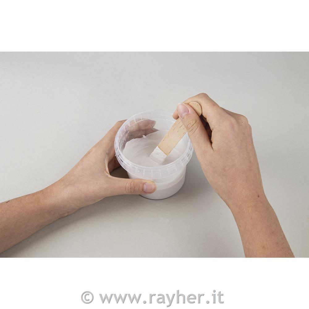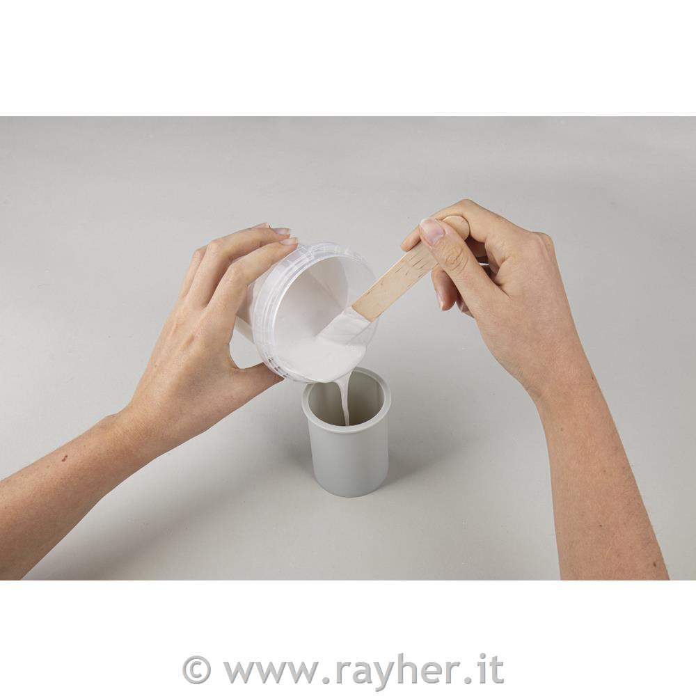 Izdelava svečnika višine 4 cm- 100g prahu za vlivanje Raysin zmešajte s 30 ml vode. Zmes premešajte s priloženo mešalno paličico, da bo gladka in brez grudic. Tako pripravljeno zmes vlijte v silikonski kalup, Previdno primite kalup in ga nekajkrat na rahlo udarite ob podlago, da sprostite morebitne zračne mehurčke, ki so se med vlivanje ujeli v zmes.