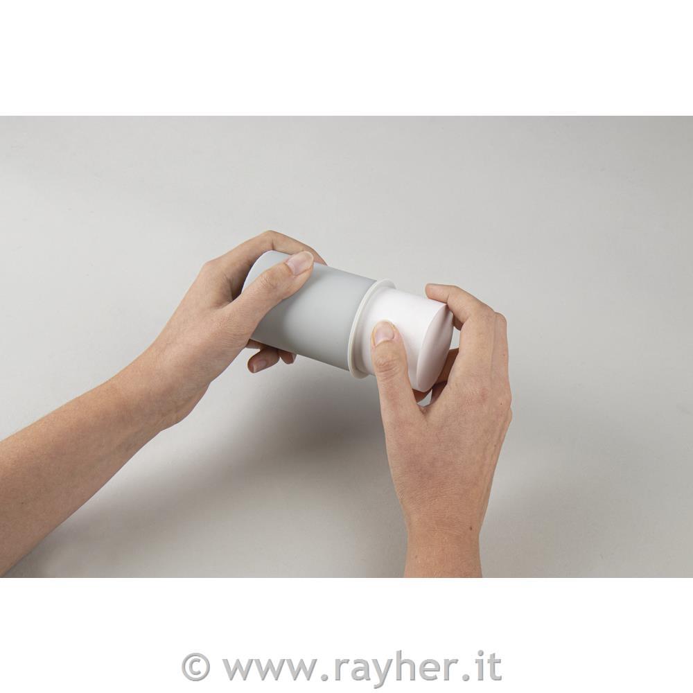 Izdelava svečnika višine 5 cm- 150g prahu za vlivanje Raysin zmešajte s 40 ml vode. Zmes premešajte s priloženo mešalno paličico, da bo gladka in brez grudic. Tako pripravljeno zmes vlijte v silikonski kalup, Previdno primite kalup in ga nekajkrat na rahlo udarite ob podlago, da sprostite morebitne zračne mehurčke, ki so se med vlivanje ujeli v zmes.