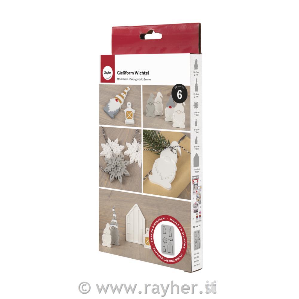 Kalup za ulivanje iz visokokakovostnega silikona, izjemno elastičen, dimenzijsko stabilen in odporen proti zmrzali/toploti (-40°C do +240°C). Zaradi raztegljivega silikonskega materiala je še posebej enostavno odstraniti ulite obeske po sušenju. Nato kalup očistite z vodo in po možnosti z malo tekočine za pomivanje posode, ki jo lahko uporabljate znova in znova. Ena od prednosti so majhni zatiči za luknje za obešanje, ki so vgrajeni v vrh motivov, ki vam olajšajo naknadno navijanje obročev, trakov itd.