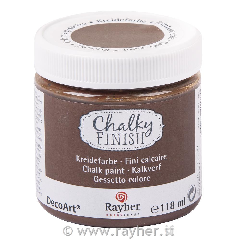 CHALKY FINISH kredne barve 118 ml dobro pokrivna barva na vodni osnovi, kredasto žametnega mat videza, omogoča doseganje različnih stilov - "cottage" do tradicionalnega, "country" do sodobnega. Podlage pred nanosom barve ni potrebno posebej pripraviti. Nanašamo jo lahko na različne podlage - pohištvo, stene, dekorativno steklo, kovino,... Barva ima dober oprijem in pokrivnost. Končni videz barve enostavno postaramo s patinami ali pa površino nežno pobrusimo z brusnim papirjem. V kolikor barvo nanašamo na neobdelan les, lahko olja/smole v lesu prehajajo skozi barvo. Preverite na skritem delu izdelka in v primeru, da opazite prehajanje olj/smol uporabite artikel 38882000 Konzervator.