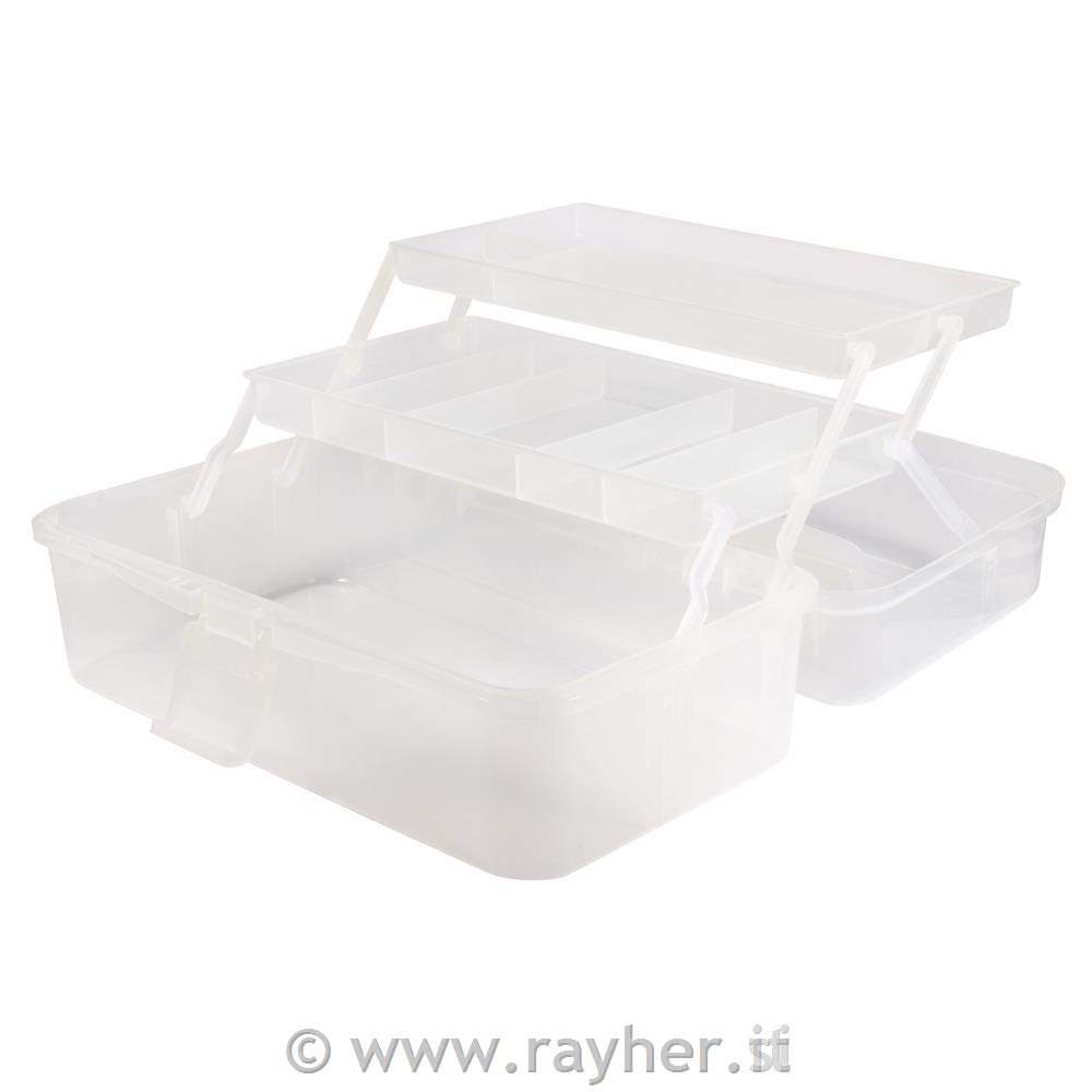 Prozorna plastična škatla dimenzij 310x170x150 mm ima pokrov, ki se na eni strani odpira s praktičnim ročajem za prenašanje. Škatla je razdeljena na 3 nadstropja. Medtem ko lahko večjo, nižjo raven uporabite tudi za udobno namestitev popolnoma težkih predmetov, kot so ročno orodje, škarje, klešče in drugo, sta zgornji dve ravni visoki približno 2,5 cm in razdeljeni na predelke različnih velikosti, ki so kot nalašč za majhne dodatki za nakit, material za beležke, peresa, lepila, žica in še veliko več.