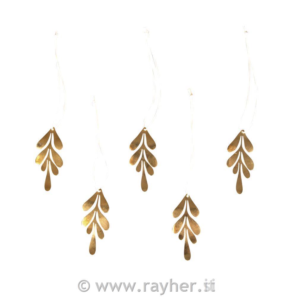 Vsebina: 5 kovinskih listov omele, izdelanih iz kovine (bakrove zlitine), 2,5 x 6 cm, s finim, lahkim obešalom (skupna dolžina z obešalom 15 cm).