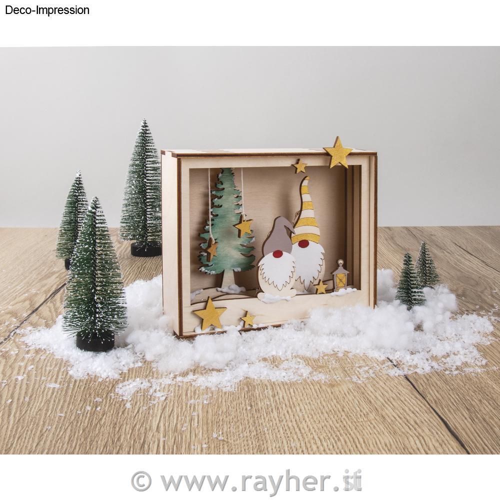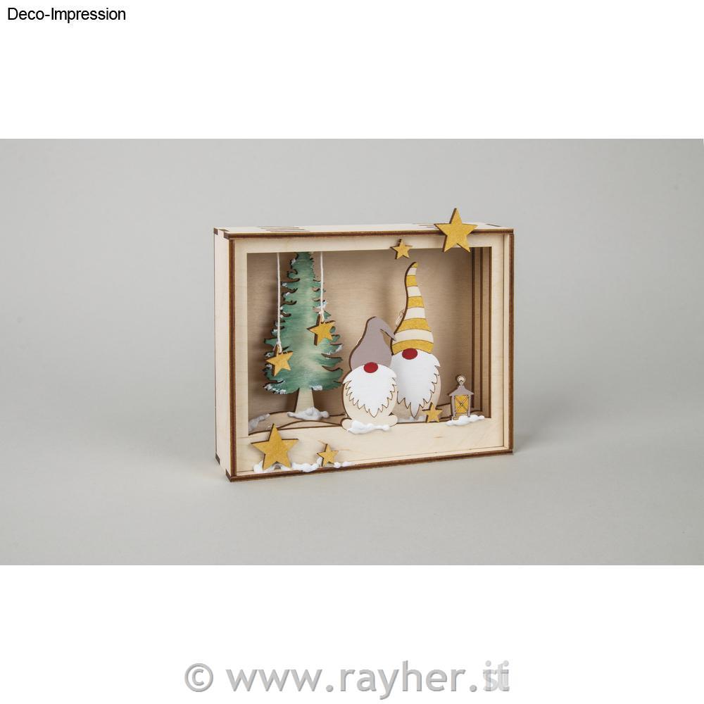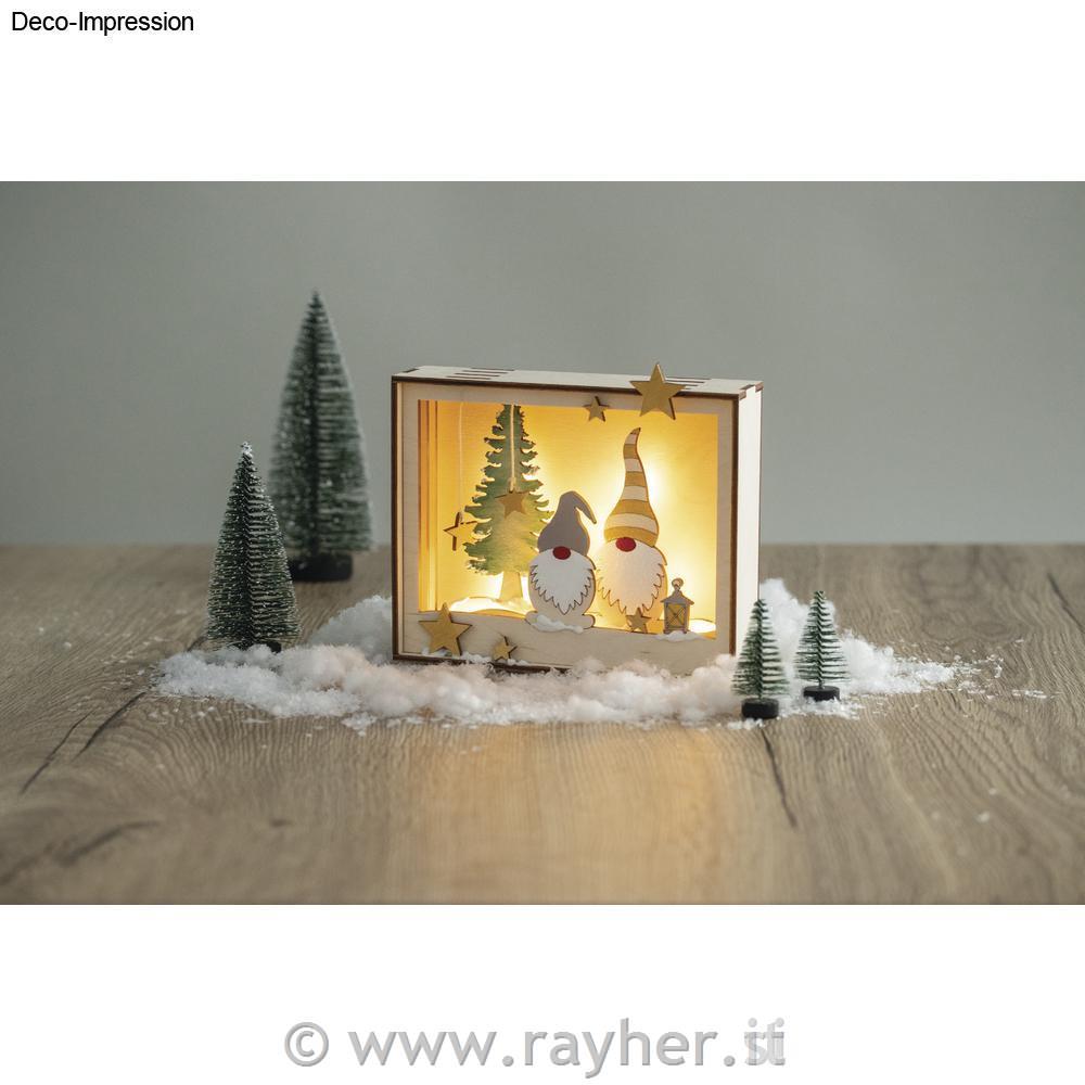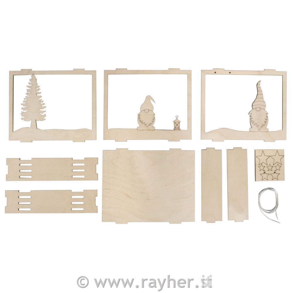 Set vsebuje : 3x vstavljivi deli z motivi, 5x vstavljivih delov za okvir, 7 lesenih zvezdic z vrvico za okrasitev. Okvir z motivom lahko ustvarjalno okrasite in ga spremenite v svetleči svetlobni element.
