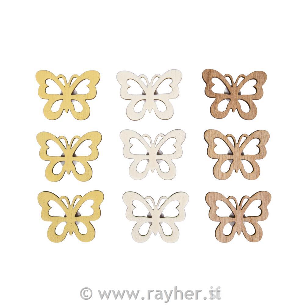 Vsebina: 9 lesenih metuljčkov, 3 x 4 cm, v rumeni, beli in naravni barvi. S smnolepilno piko na hrbtni strani za hitro lepljenje. Enostavno odlepite folijo in jo prilepite.