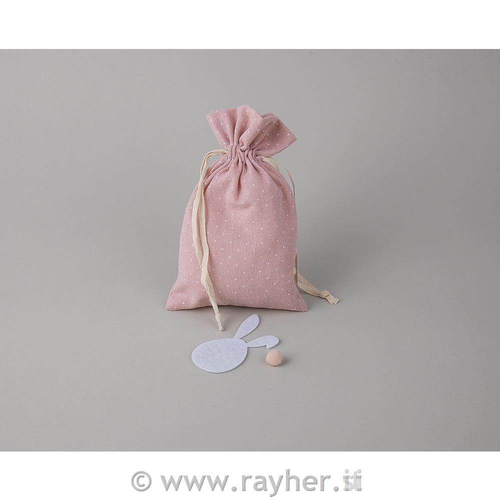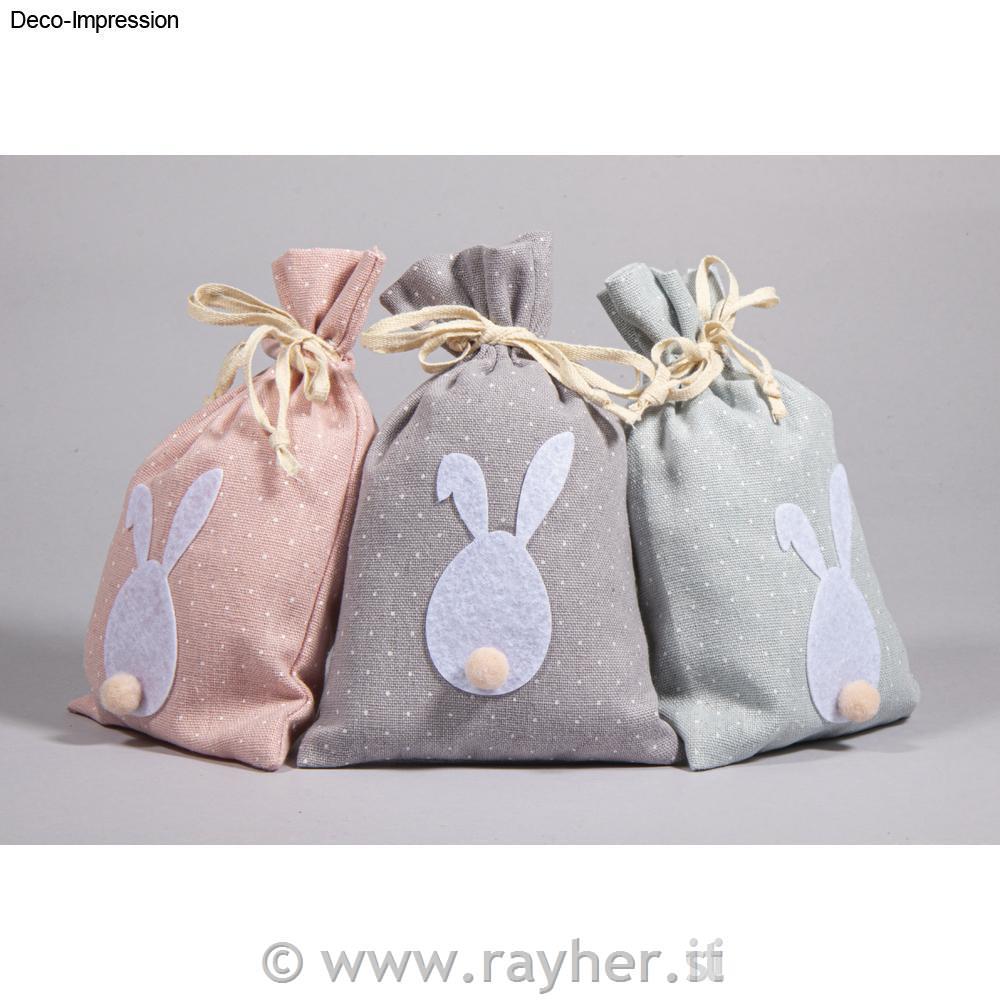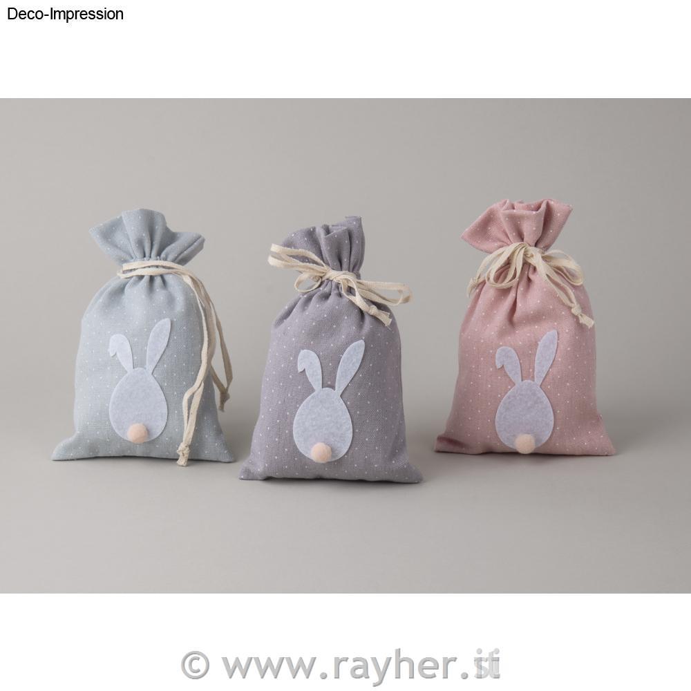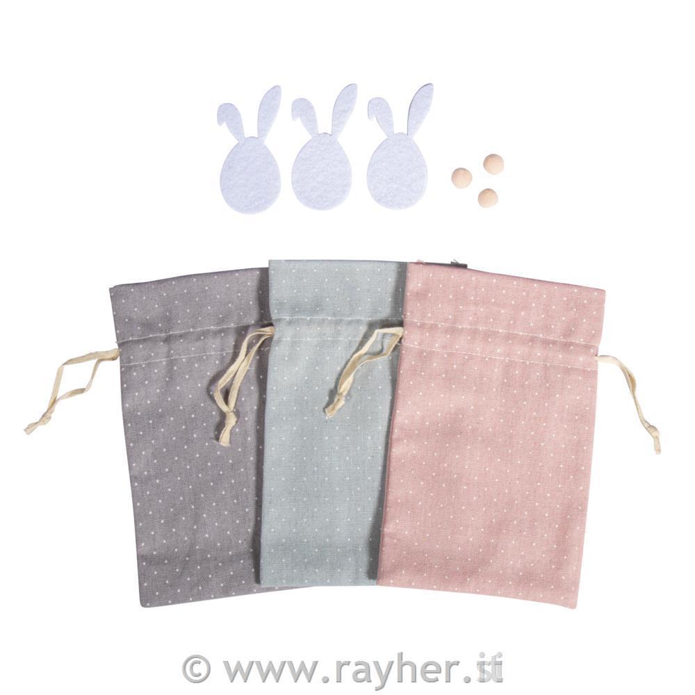 Komplet vsebuje 3 vrečke iz blaga z vrvico dimenzije 12 x 19,5 cm , v nežnih pastelnih barvah rosé, lila, blue, z drobnimi belimi pikami in bombažnim trakom (100 % bombaž) kot vrvico, 3 izrezke zajčkov iz klobučevine in 3 pompončke za repke.