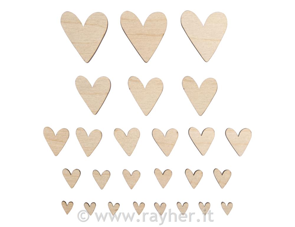 Contenuto: 26 cuoricini di legno di varie dimensioni, da 1 a 4 cm, tagliati al laser con un bordo marrone bellissimo (8x 1 cm, 6x 1,5 cm, 6x 2 cm, 3x 3 cm, 3x 4 cm).