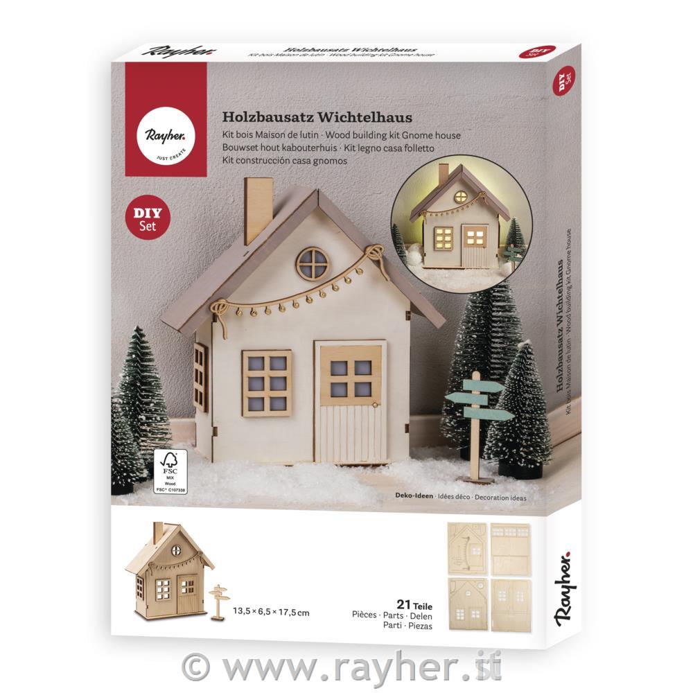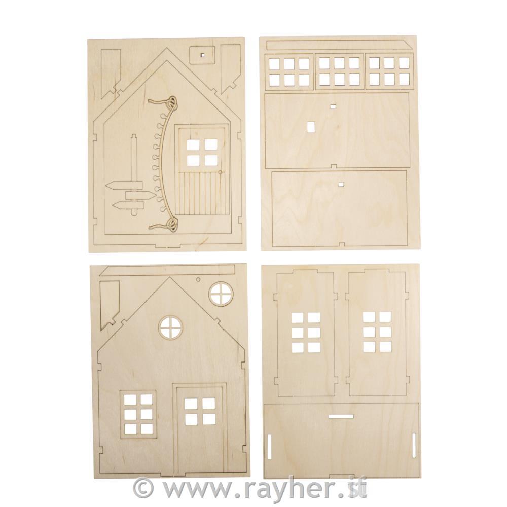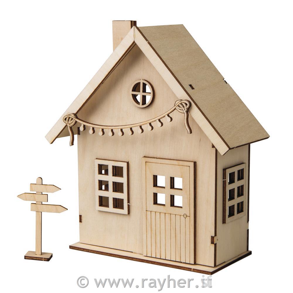 z lasersko izrezanega približno 3 mm debelog lesenega kompleta se posamezni deli enostavno odstranijo z obrtniškim nožem in sestavijo po podrobnih navodilih. Po želji lahko dele pobarvate, okrasite, posujete z bleščicami, posujete z umetnim snegom itd. Hišico je mogoče notranje osvetliti z LED verigo lučk.