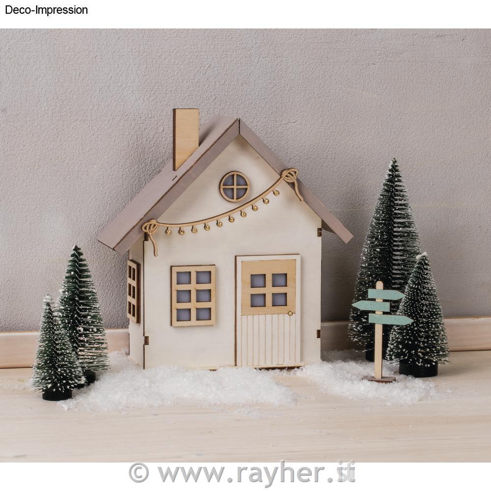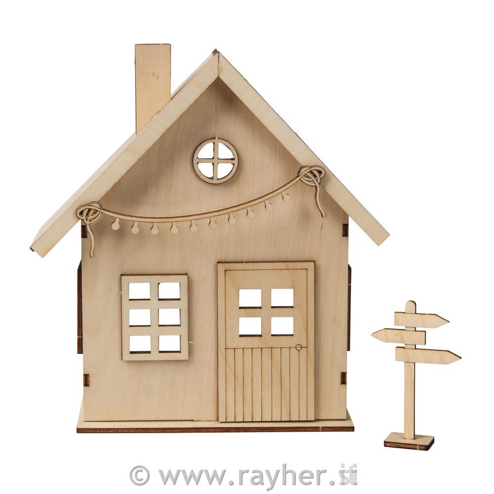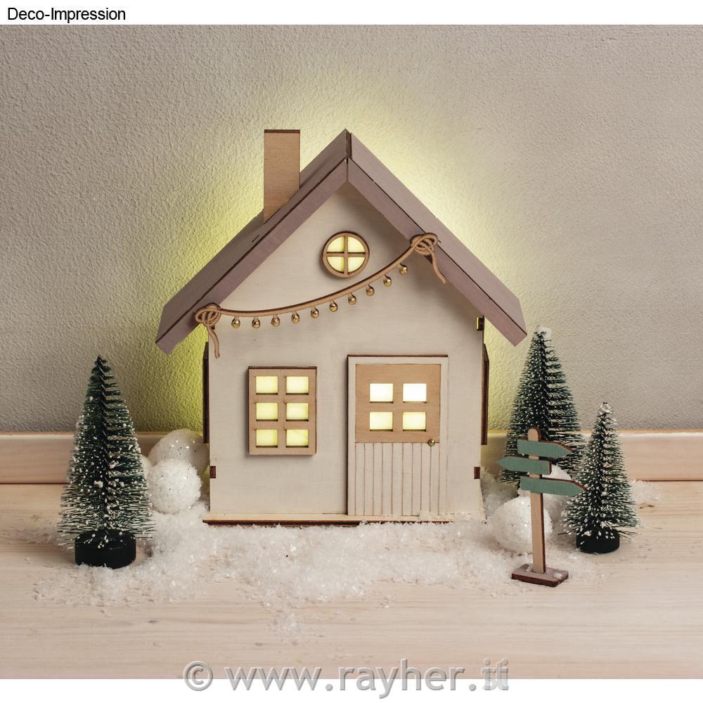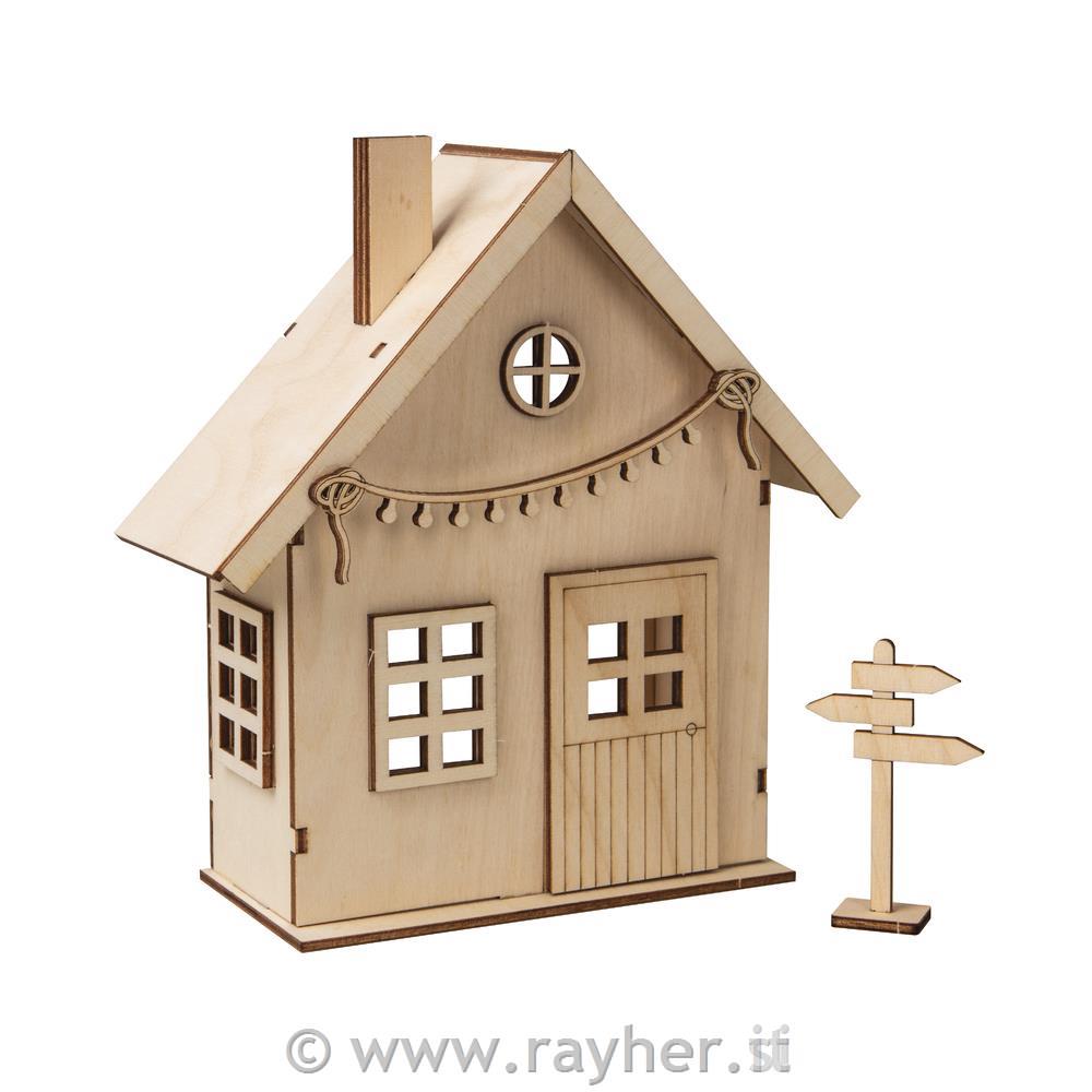 z lasersko izrezanega približno 3 mm debelog lesenega kompleta se posamezni deli enostavno odstranijo z obrtniškim nožem in sestavijo po podrobnih navodilih. Po želji lahko dele pobarvate, okrasite, posujete z bleščicami, posujete z umetnim snegom itd. Hišico je mogoče notranje osvetliti z LED verigo lučk.