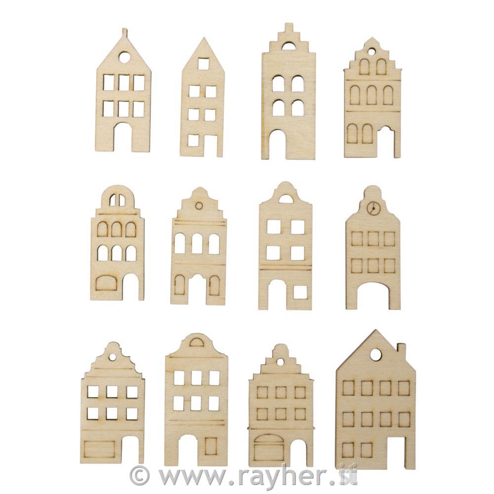 Prikupne lesene hišice, 12 različnih motivov, velikosti 3,5 – 4,2 cm, po en kos od vsakega: