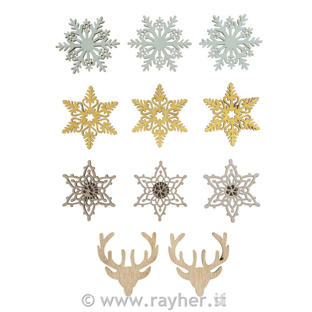 Filigranski leseni okraski za dekoracijo. Na zadnji strani imajo lepilno piko.V zavoju je 11 kosov; štirje različni motivi. Velikost približno 4cm.