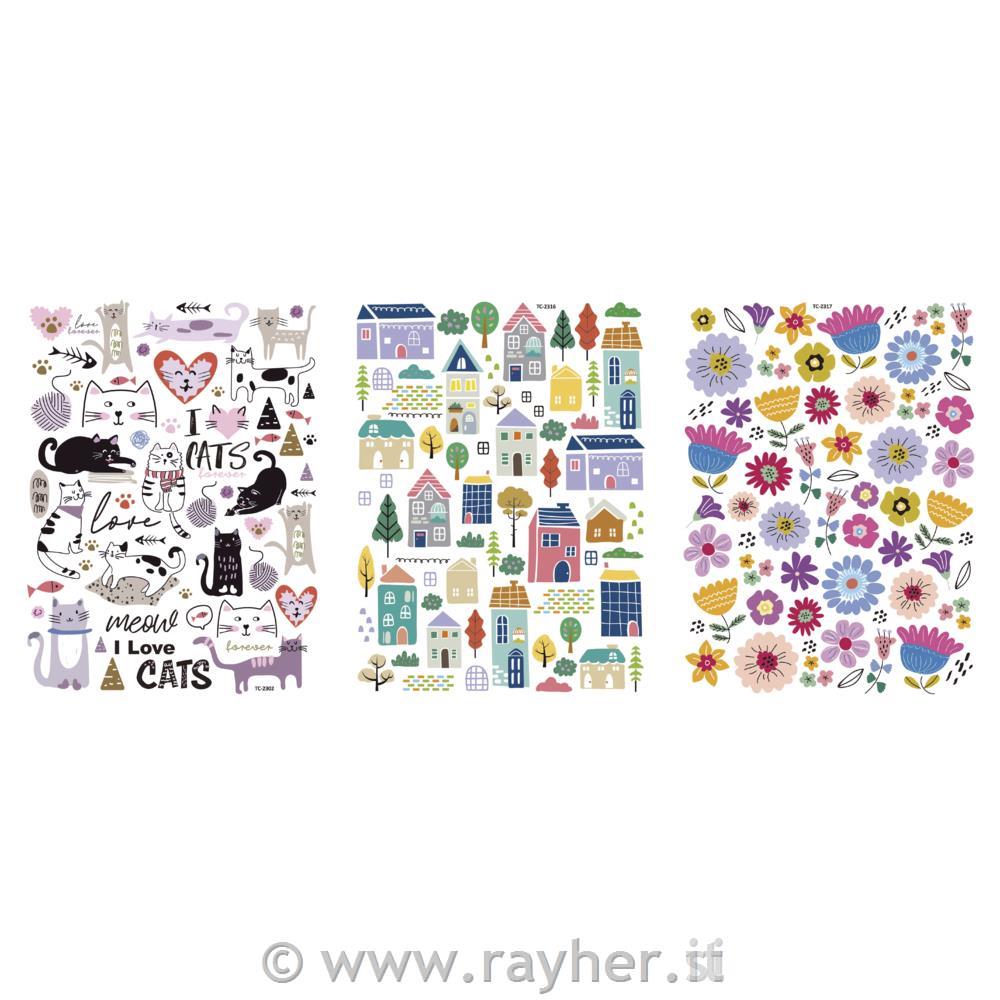3 lista za prenos "Rub on", vsak list velikosti 15 x 20 cm, z različnimi motivi hiš, mačk in cvetov.