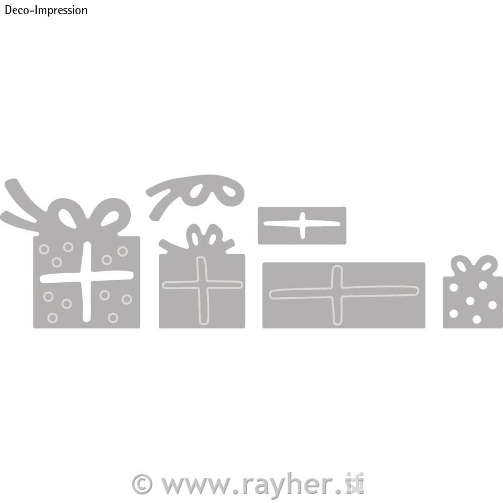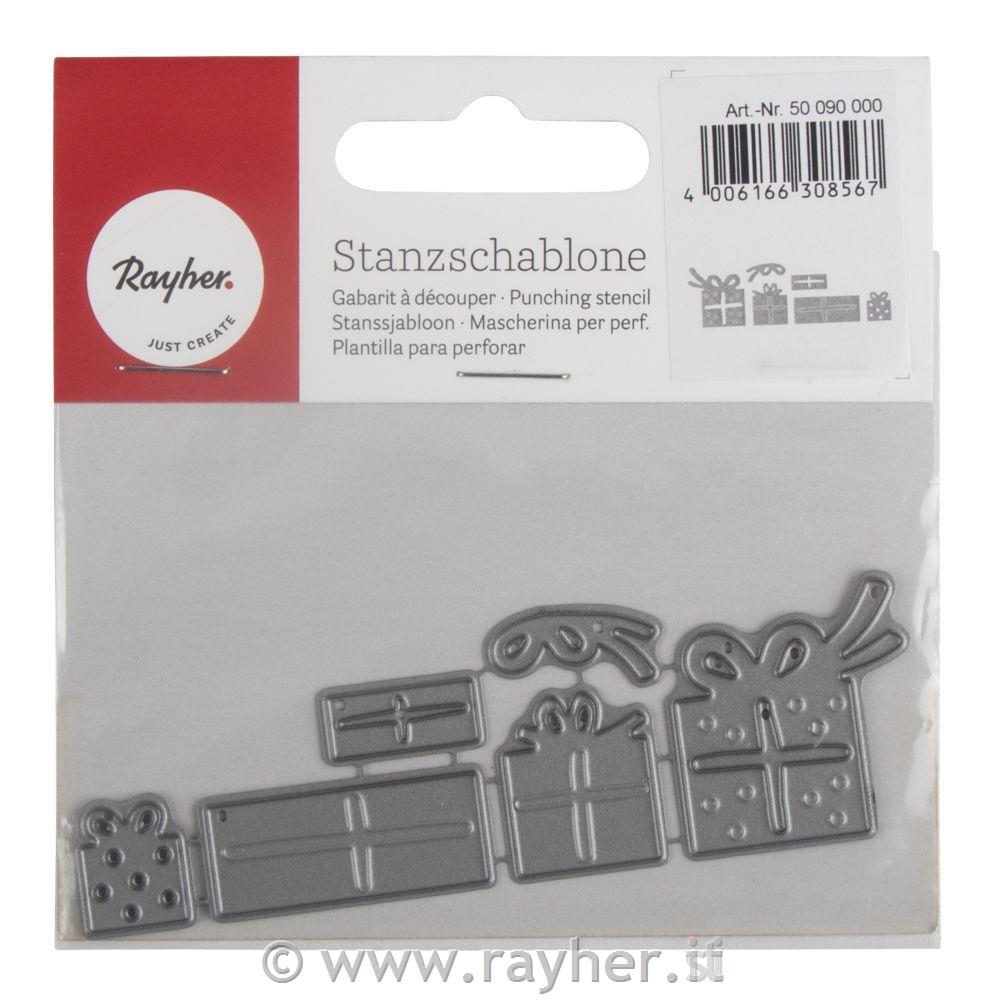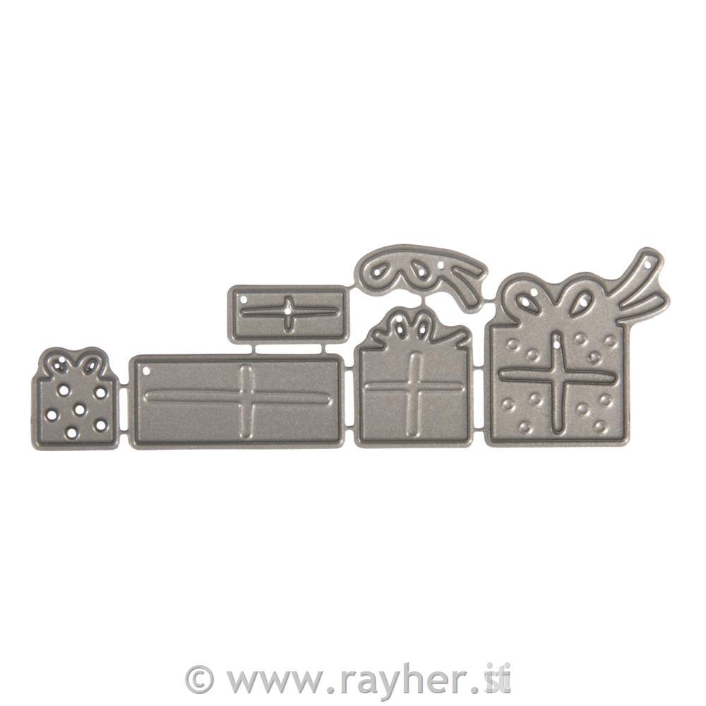 Kompletrezalnih šablon obsega 6 kosov in je sestavljen iz petih različnih daril z različnimi vzorci v velikostih od 0,7x1,2 cm do 1,2x3,1 cm ter darilne pentlje v velikosti 0,6x1,9 cm