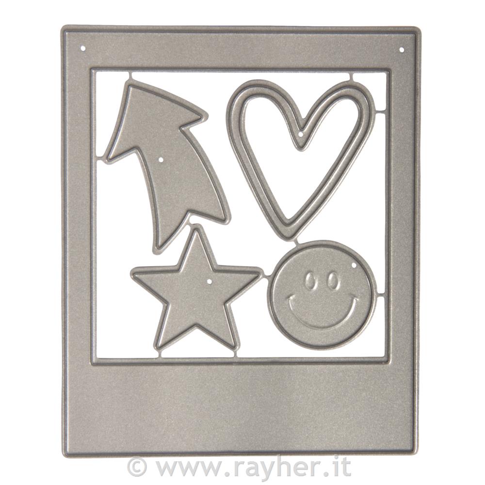 5-delni set sestavljajo okvir za fotografijo velikosti 7x8,5 cm in 4 majhni motivi (smeško, zvezda, puščica in srce) velikosti približno 2 cm.