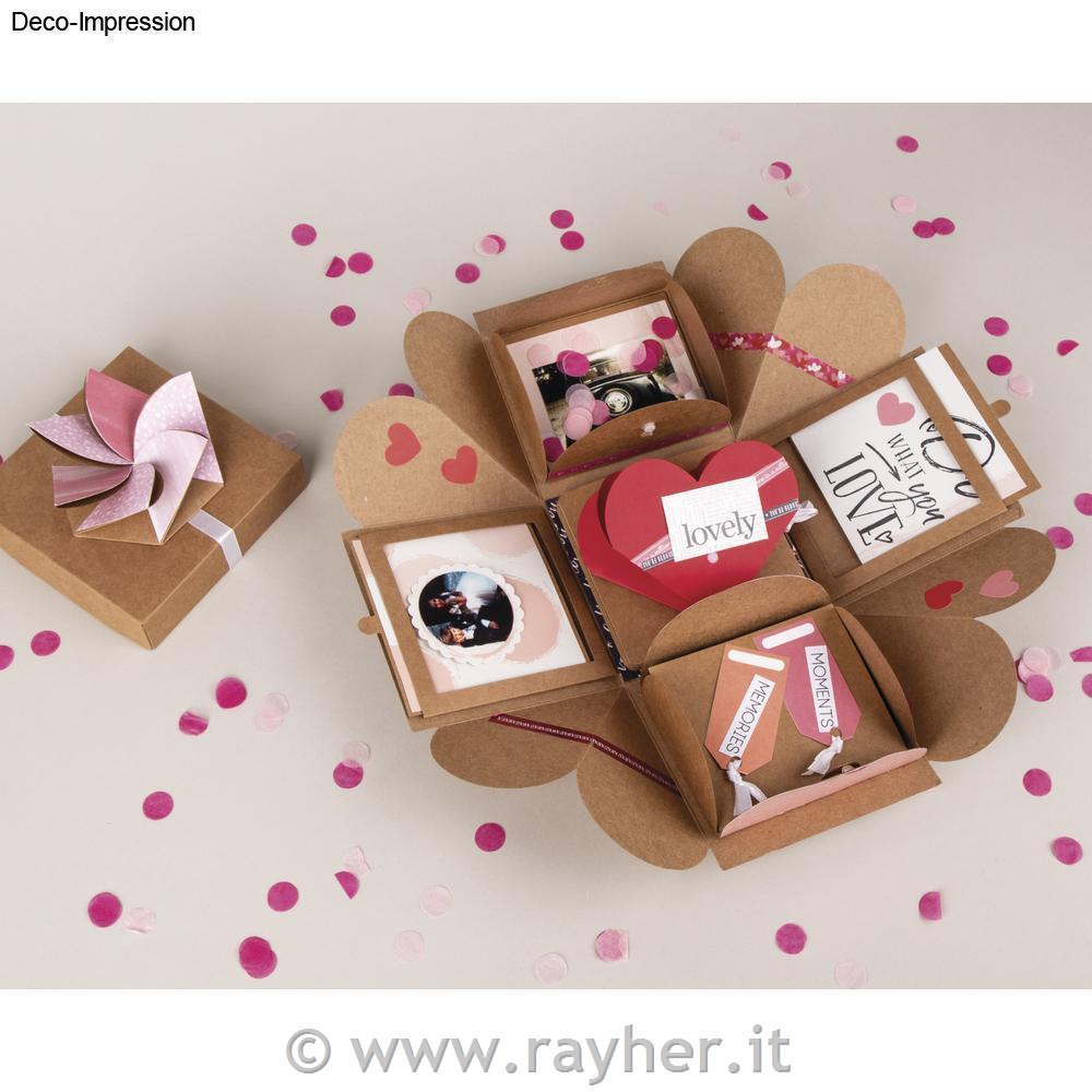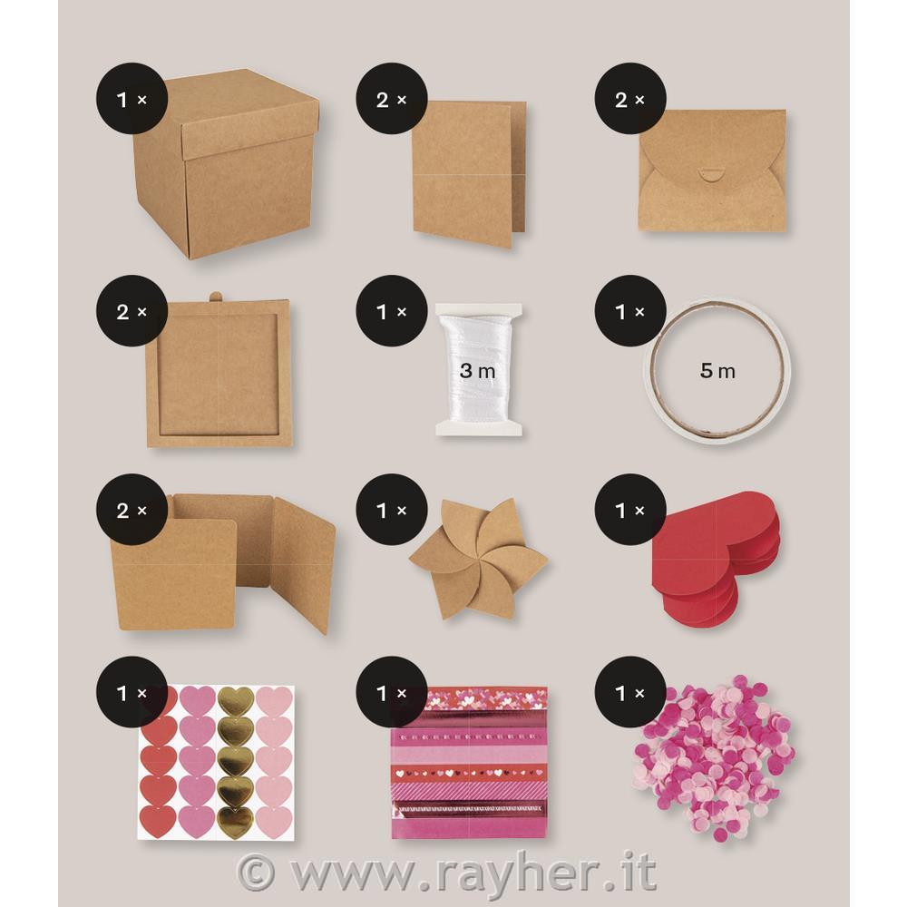 • Eksplozijsko škatlo lahko oblikujete individualno: s slikami, osebnimi sporočili, motivnimi listi papirja, žigi, nalepkami, trakovi in še marsikaj…