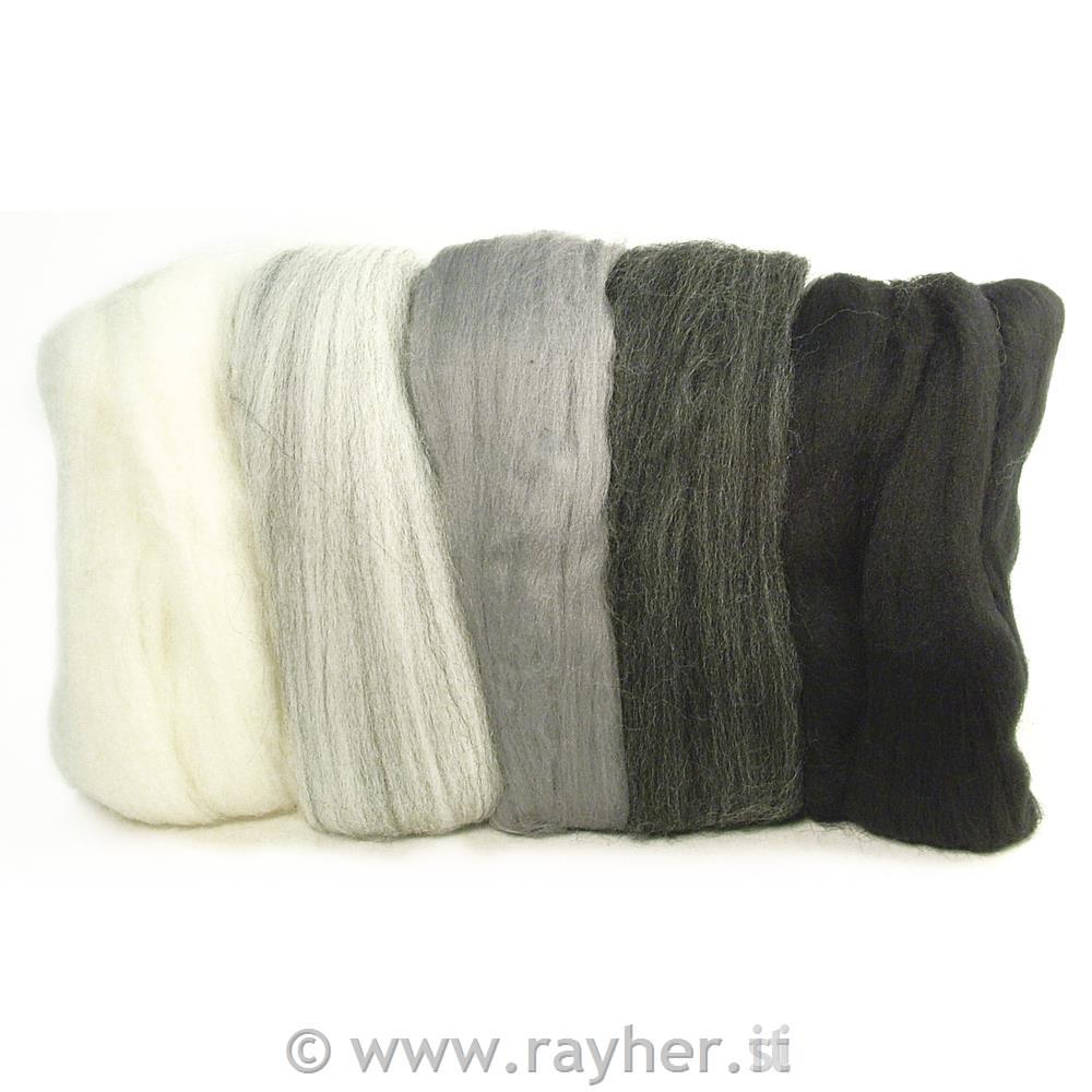 Volneno merino predivo, česano, zelo gladko, črno-beli-sivi odtenki, 18 mic, 5 x 10g