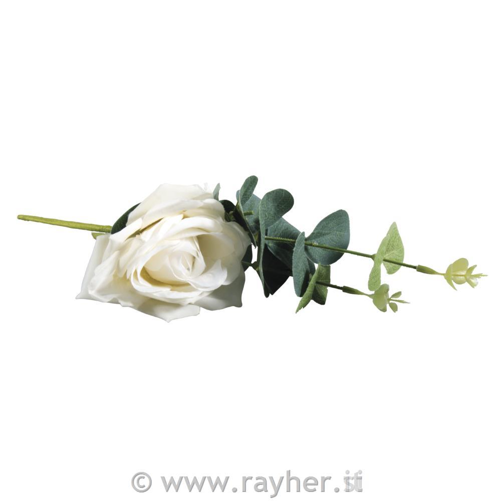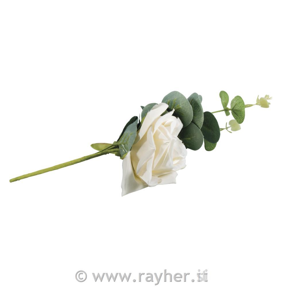 Kraljica med cvetjem. Nežni cvetni listi vrtnice v kombinaciji z vejico evkaliptusa so videti zelo resnični.