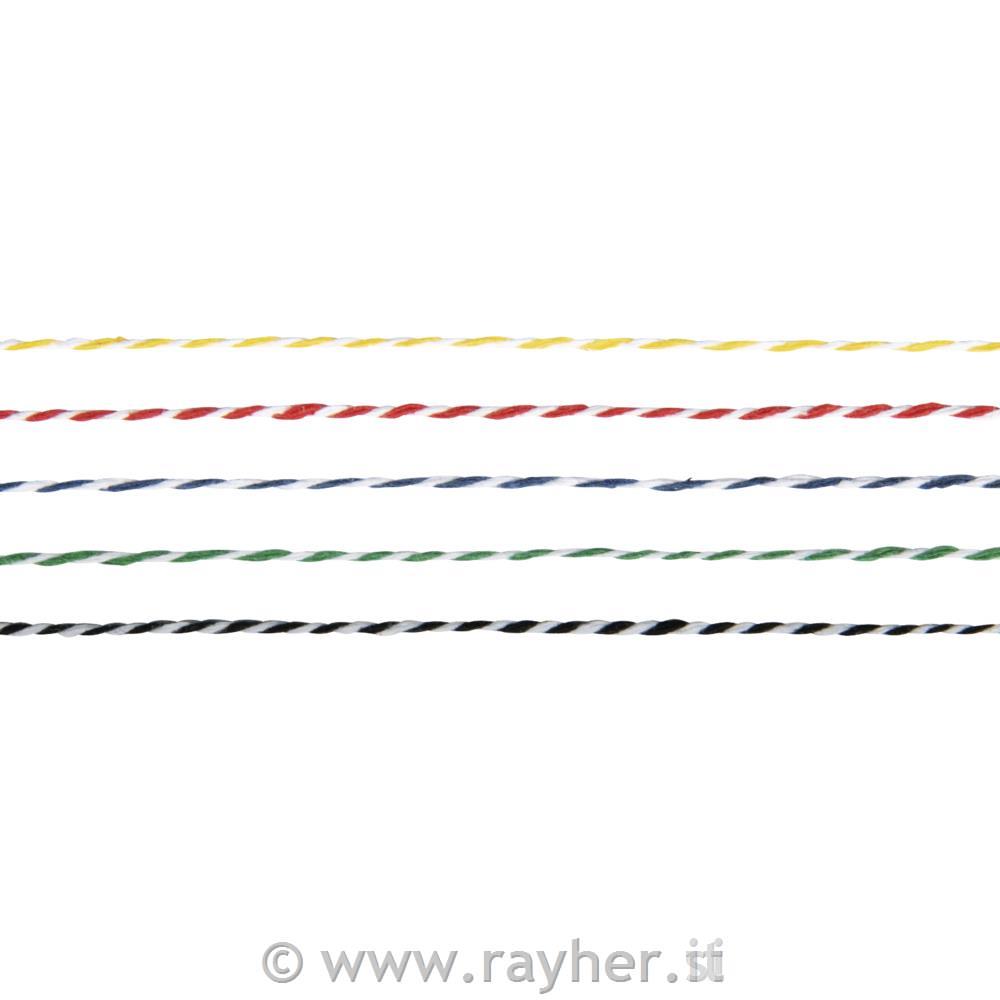 V setu so osnovne barve vrvice ( rdeča, črna, modra, zelena, rumena ) prepletene z belo nitjo. Vrvice so odlične za izdelkovanje zapestnic prijateljstva, za dekoracijo, pri zavijanju daril,...