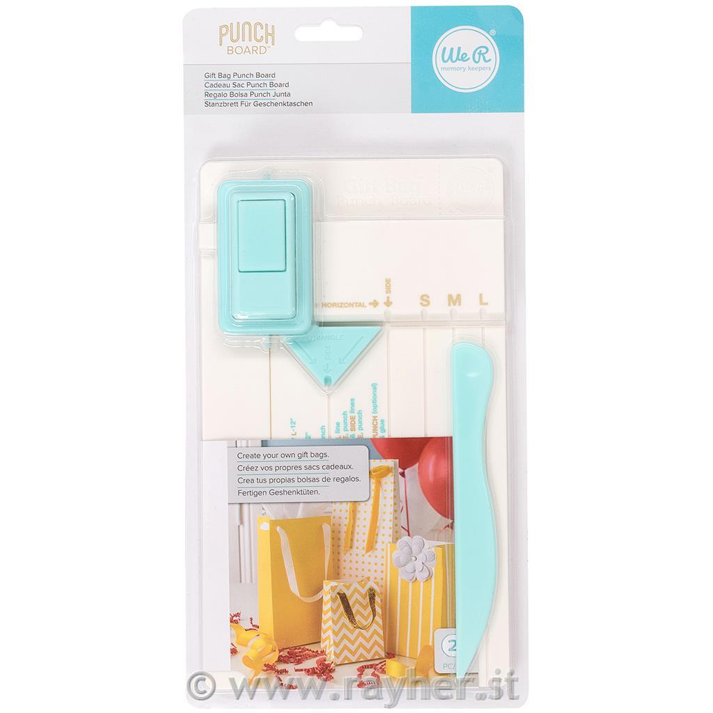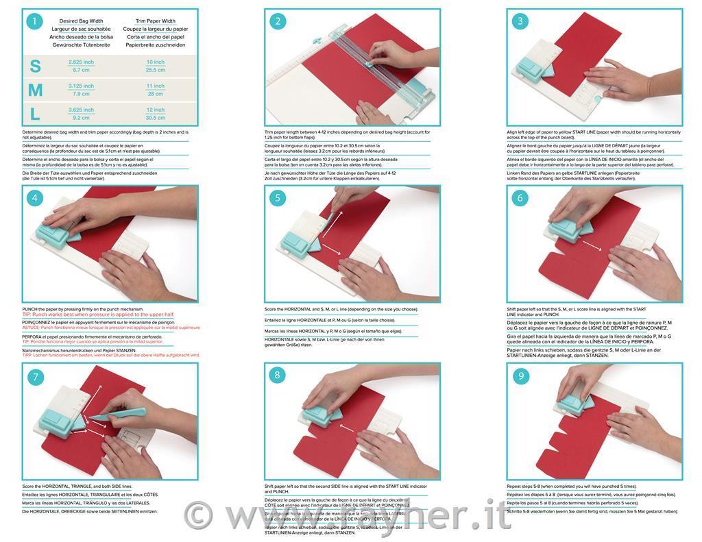 Inovativna rezalna plošča združuje luknjač in orodje za točkovanje, kar olajša izdelavo darilnih vrečk različnih dimenzij. Enostavna navodila so natisnjena na zadnji strani plošče.