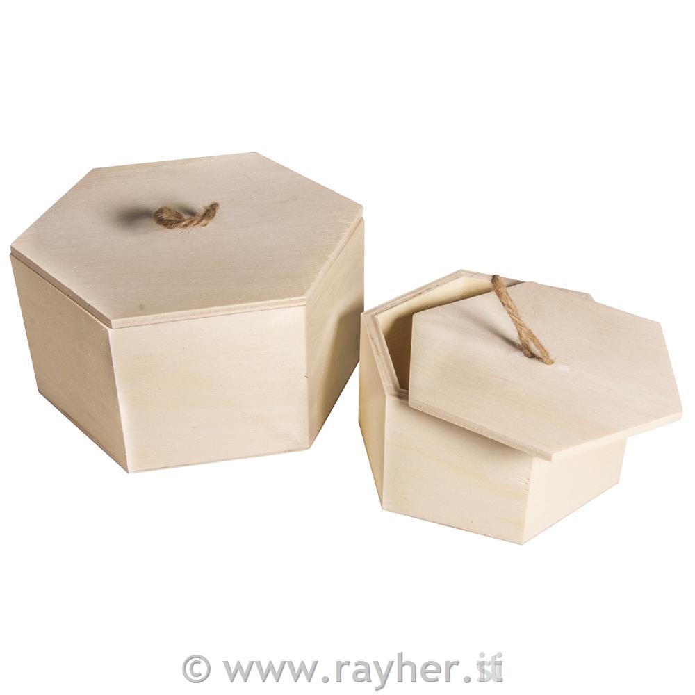 V te čudovite škatle s šestimi vogali lahko shranite številne majhne zaklade. V setu sta dve leseni škatli dimezije 16x14x8,3cm in 12x10,6x6,5cm. Škatle lahko pobarvate, okrasite ali jih pustite v naravem odtenku in jih zaščitite z akrilnim lakom.
