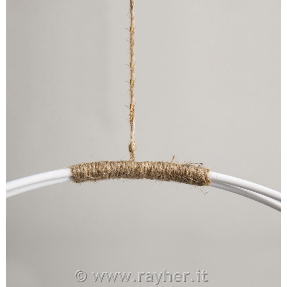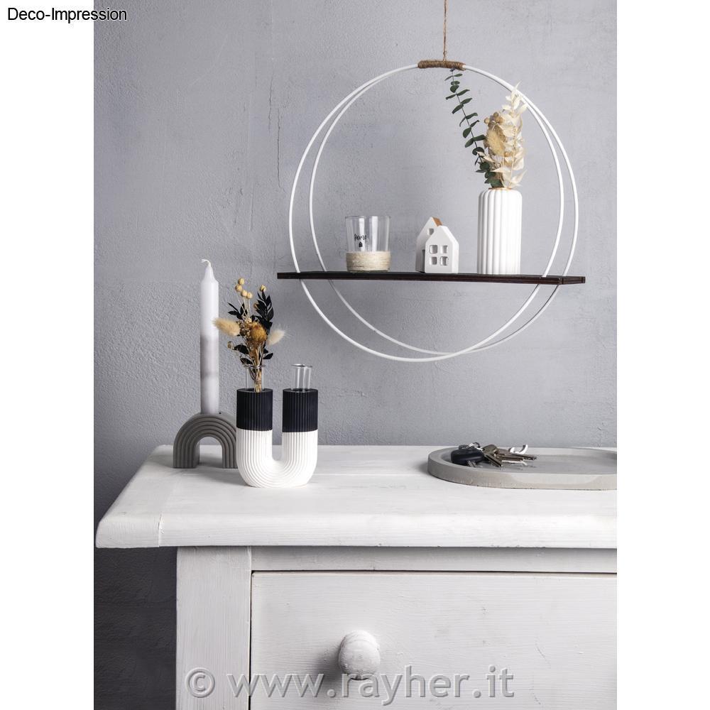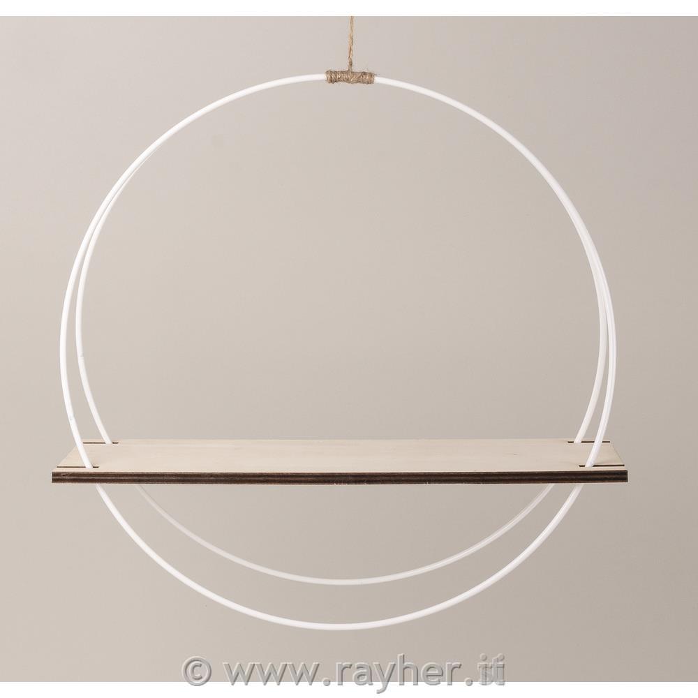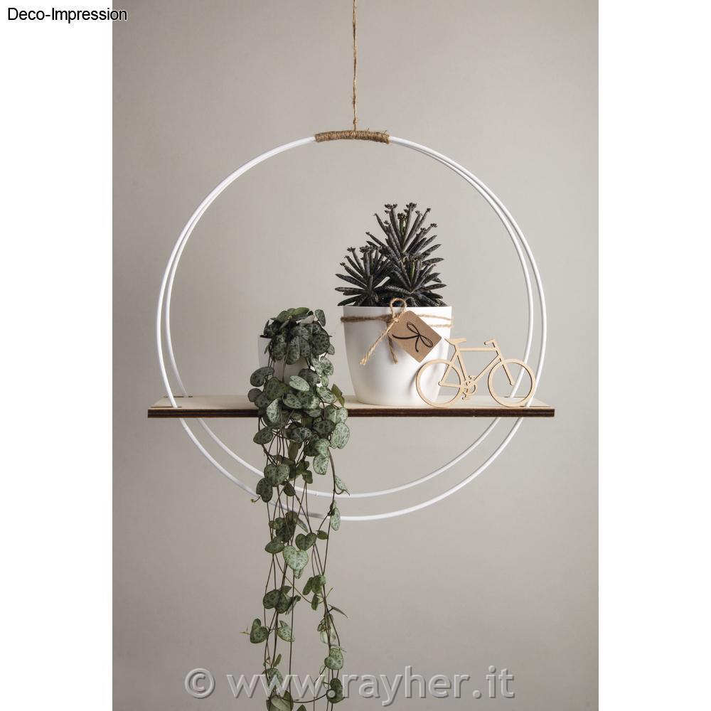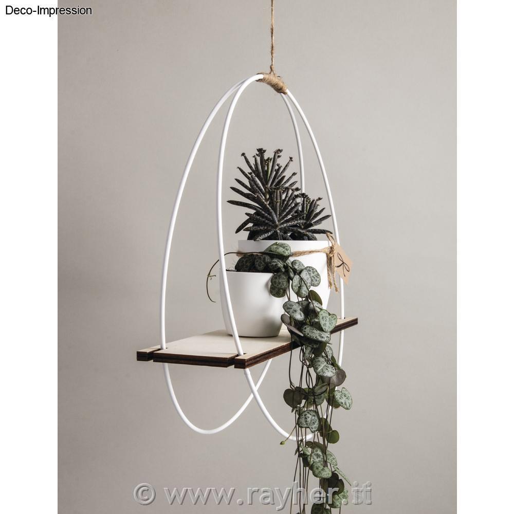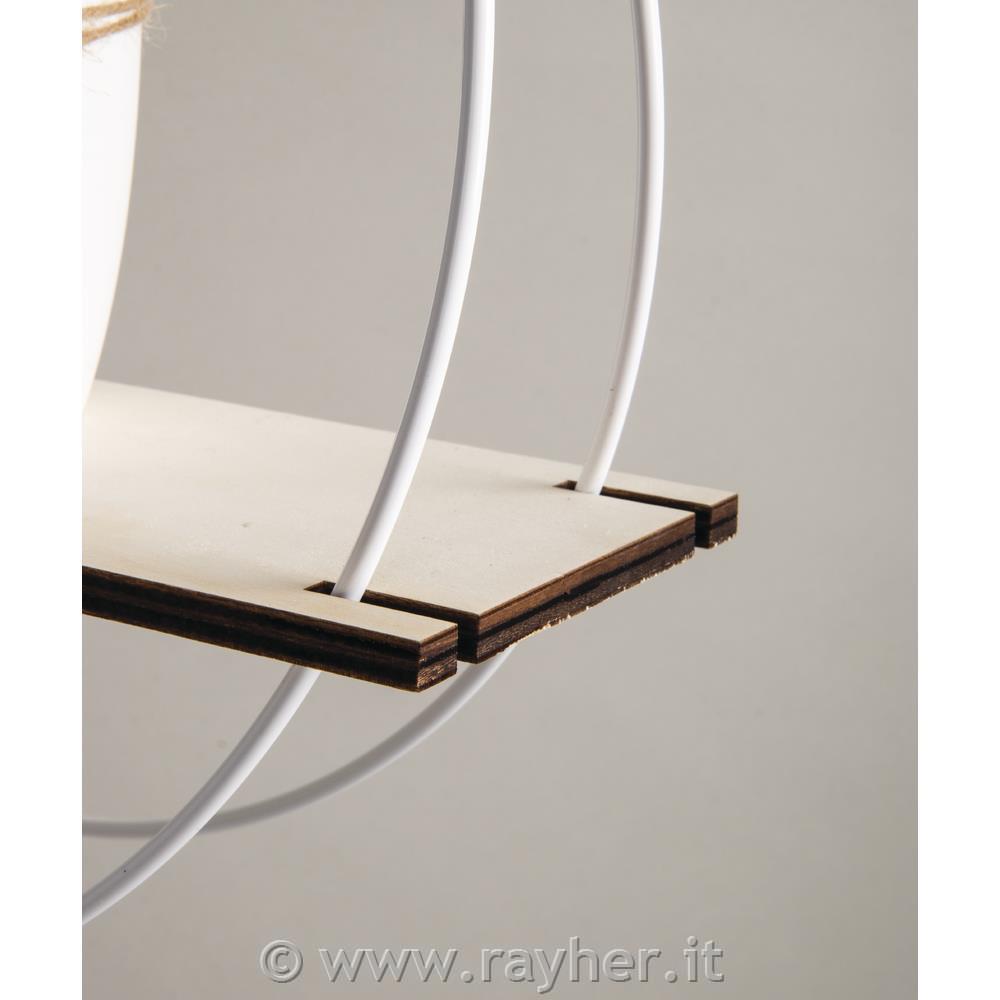 Lesena deska se vpne v spodnji tretjini med dva kovinska obroča in se pritrdi po želji. Kovinska obroča se na vrhu združita in držita skupaj s pomočjo sisalove vrvice, ki služi tudi kot obešalnik. Enostavna, hitra in vsestranska uporaba, npr. za prosto obešanje, na okno, na vhodna vrata ali za dekoracijo prostorov in sten. Primerno za majhne najljubše stvari, mini vaze s svežim ali suhim cvetjem in še veliko več. Na leseni deski v obročih lahko razstavite majhne okrasne predmete, mini lončke za rastline...