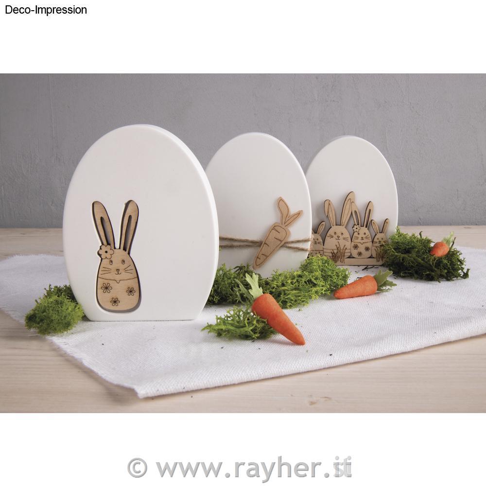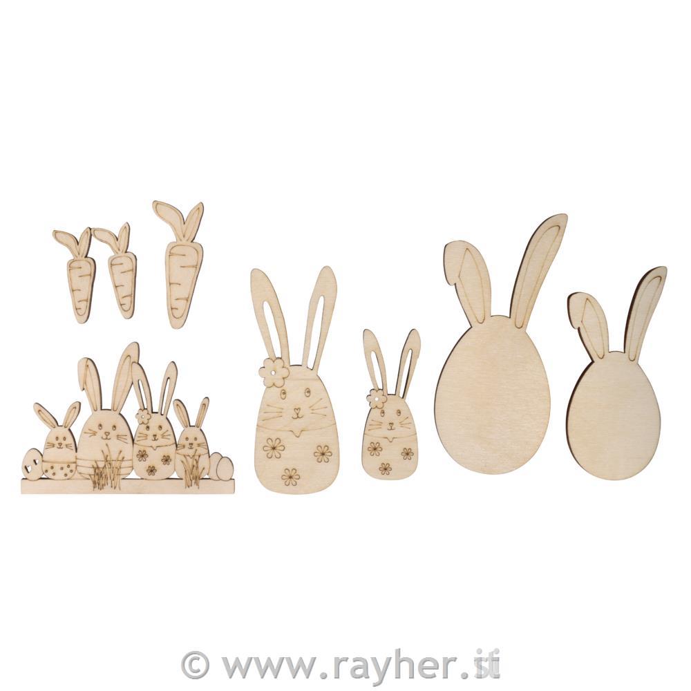 Il pacchetto contiene otto motivi di coniglietti e carote con dimensioni comprese tra 4 e 8,8 cm. Alcuni elementi in legno hanno volti e decorazioni disegnati, mentre altri sono completamente naturali.
