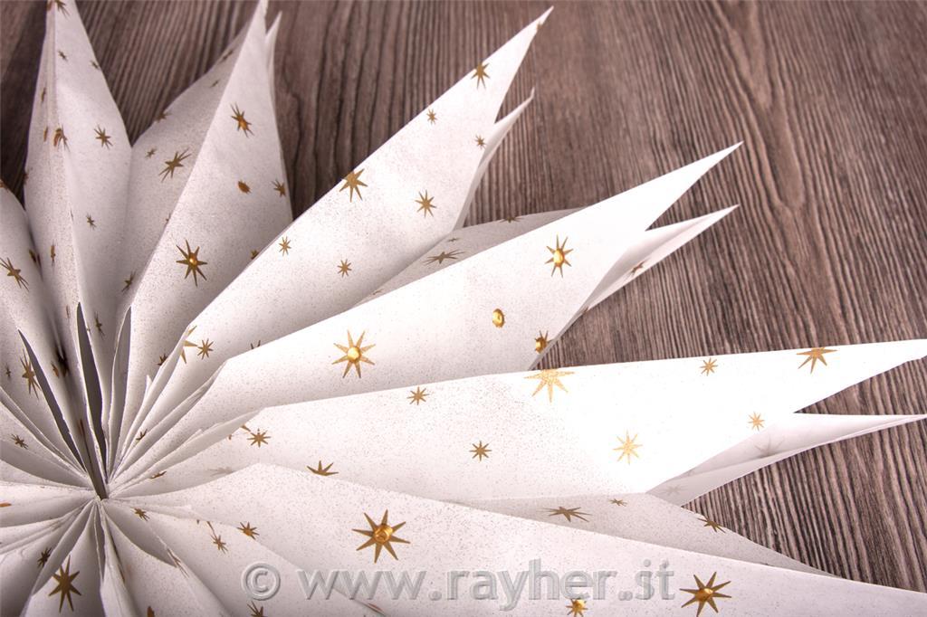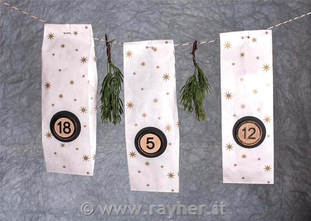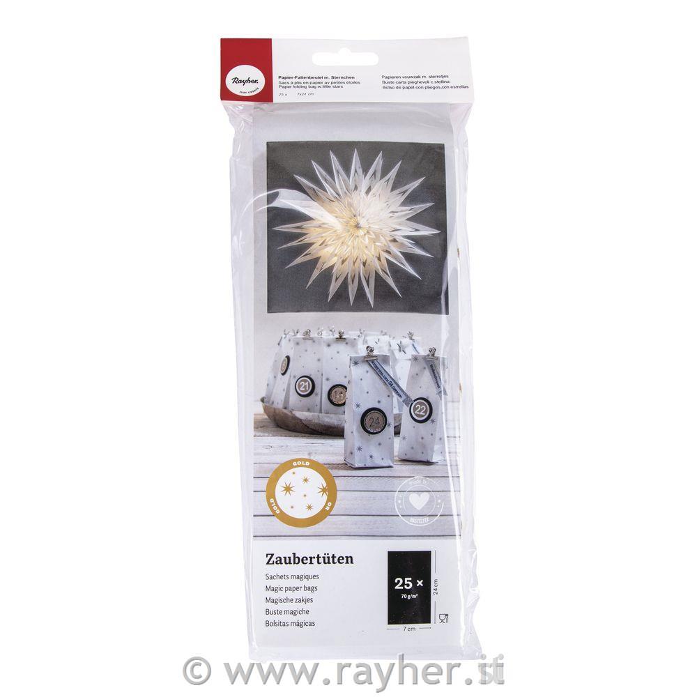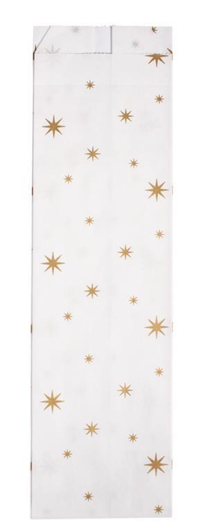 Ne glede na to, ali je božična embalaža ali zložena in zlepljena za izdelavo prefinjenih papirnatih zvezd - bela papirnata vrečka z dimenzijami 7 x 24 cm in prazničnim tiskom zvezd je vsestranska.