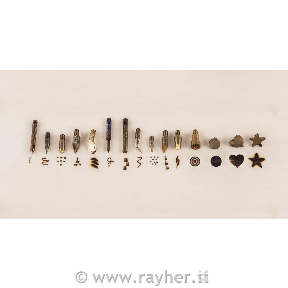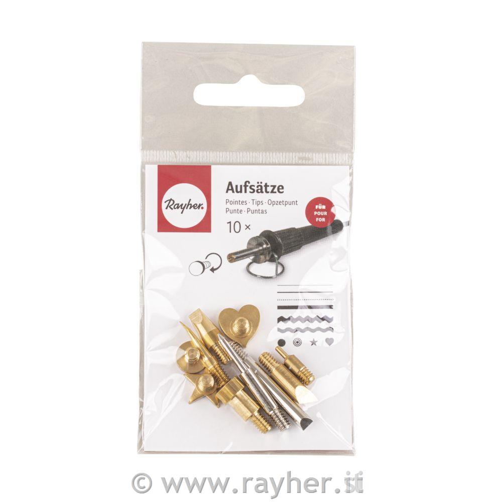 10 nastavkov se odlično prilega pirografu Rayher (Art. 89366000) in je razvrščenih v različne vzorce, kot so srce, zvezda, spirala, krog, ter različne konice različnih debelin in oblik.