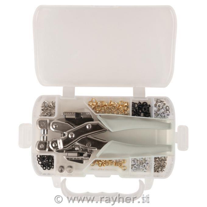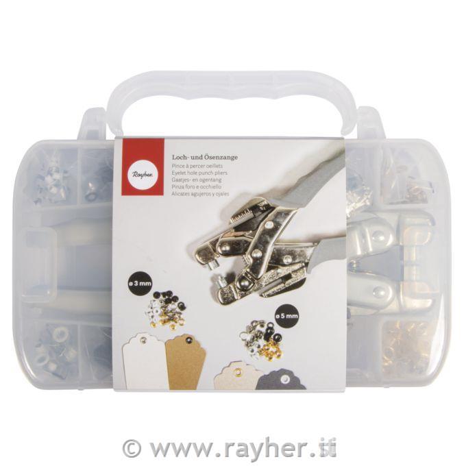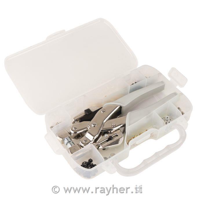 Železne klešče za luknjanje so dobro oblikovane, uporabne, dolgotrajne in primerne za vstavljanje kovic za luknje premera 3 in 5 mm. Pakirani so v trdni plastični škatli za varno shranjevanje, ki vsebuje 80 kovic z luknjo premera 3 mm in 80 premera 5 mm (skupaj 160 kovic z luknjo) v 4 različnih barvah (bela, črna, srebrna, zlata).