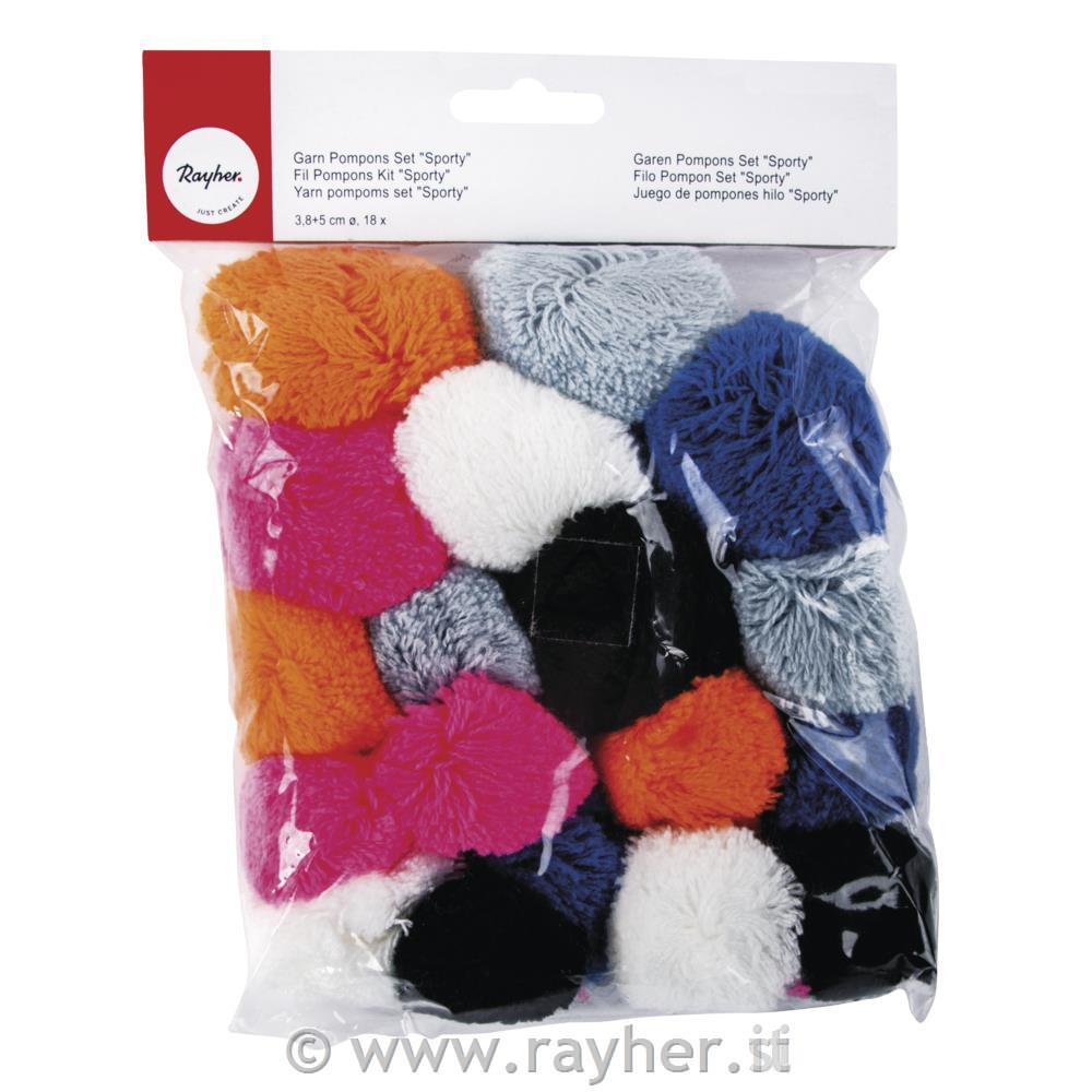 Yarn pompoms set "Sporty", 3.8+5cm o, assorted in colour+size, tab-bag 18pcs