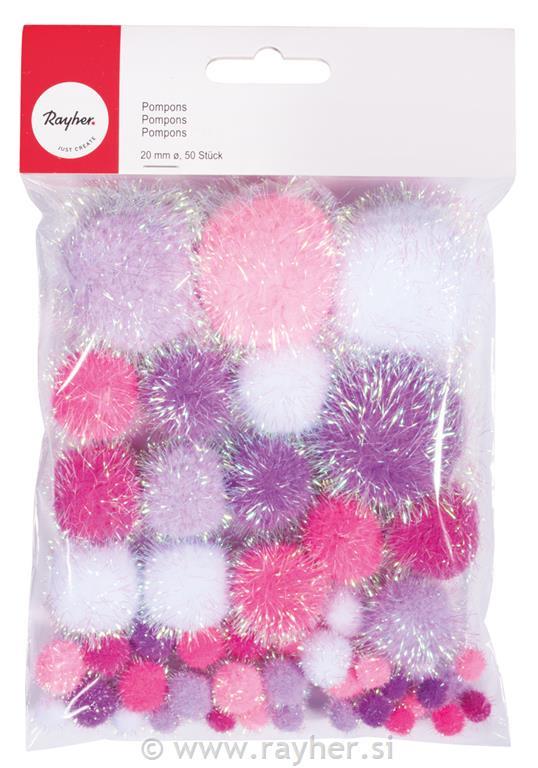 Metallic pompons, assorted, pink-white,colour+size assorted, tab-bag 50pcs