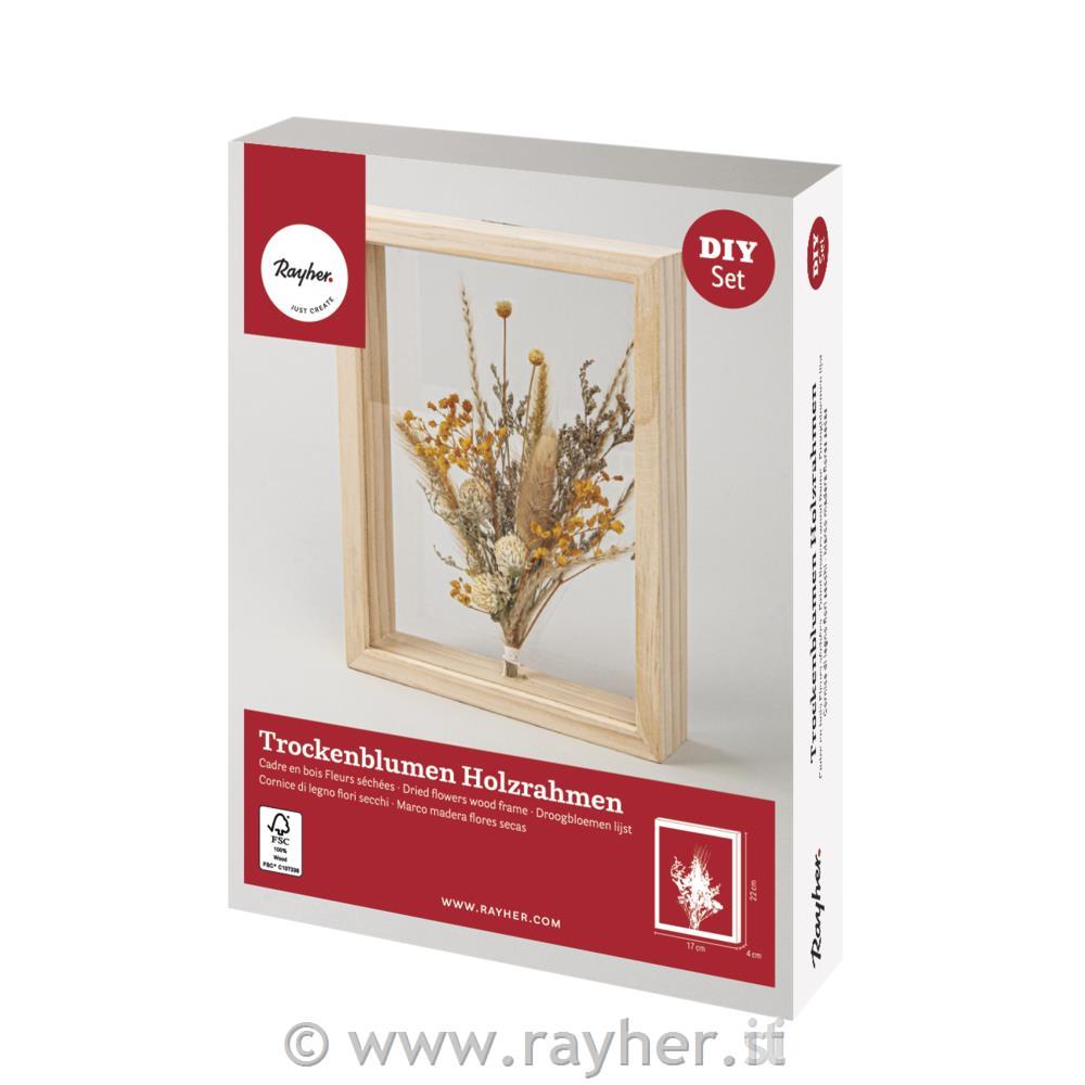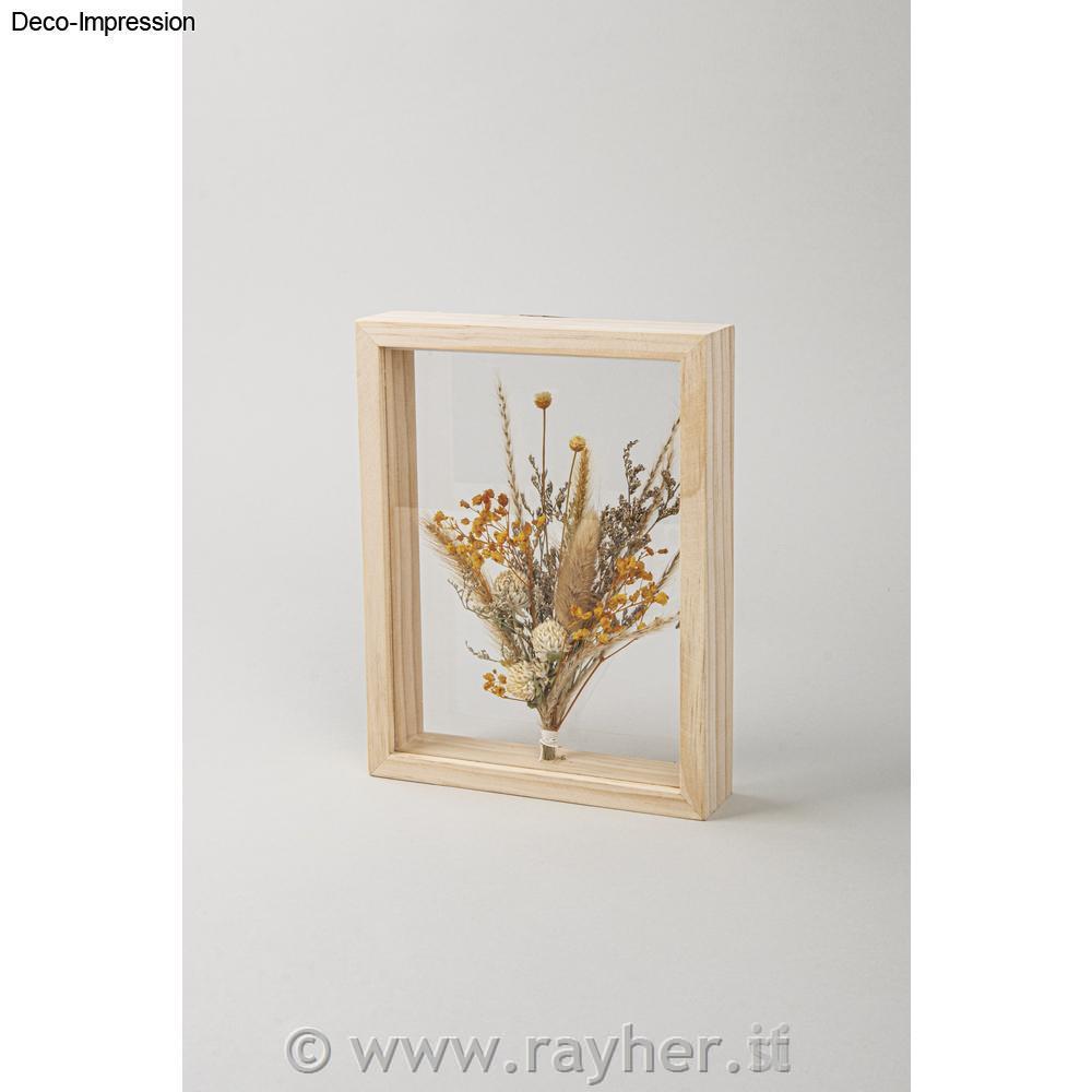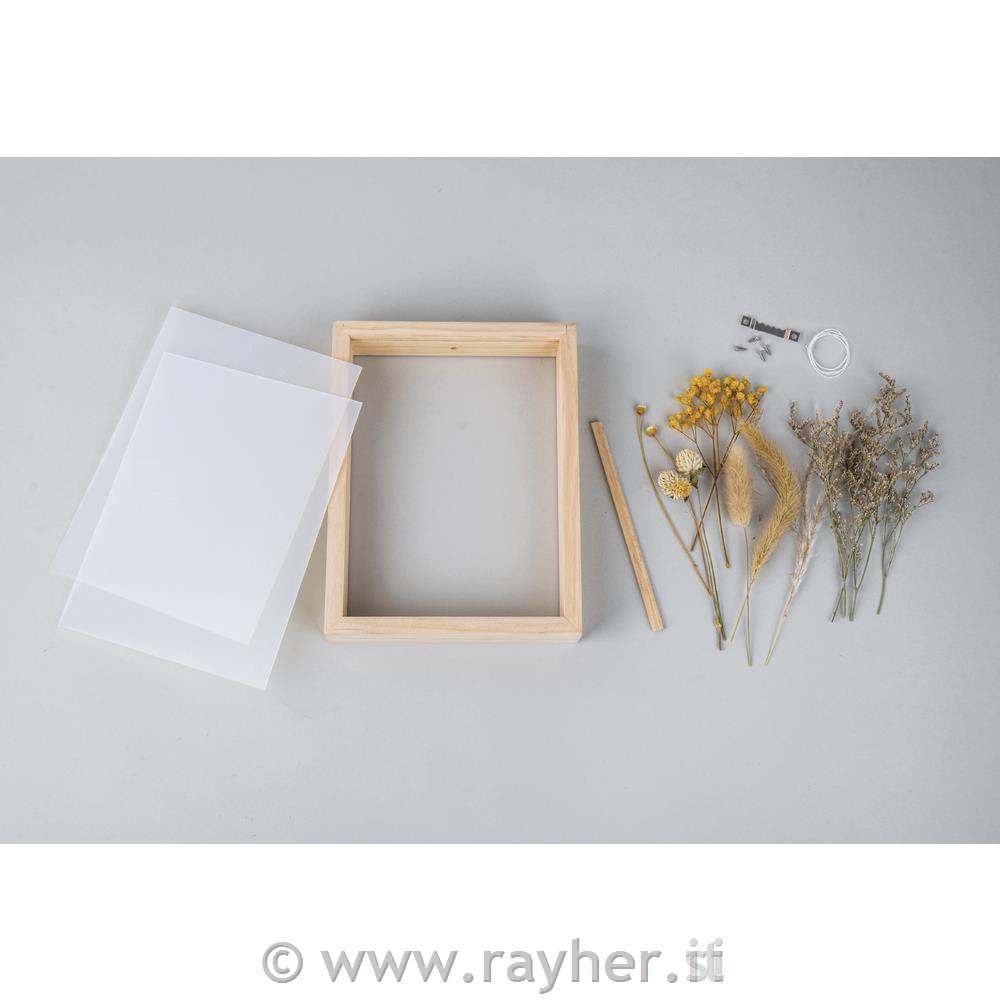 Set vsebuje 1x lesen okvir 17x22x4 cm, 2x prosojni plošči iz tanjšega pleksi stekla, obešanka za okvir ter šopek posušenega cvetja.
