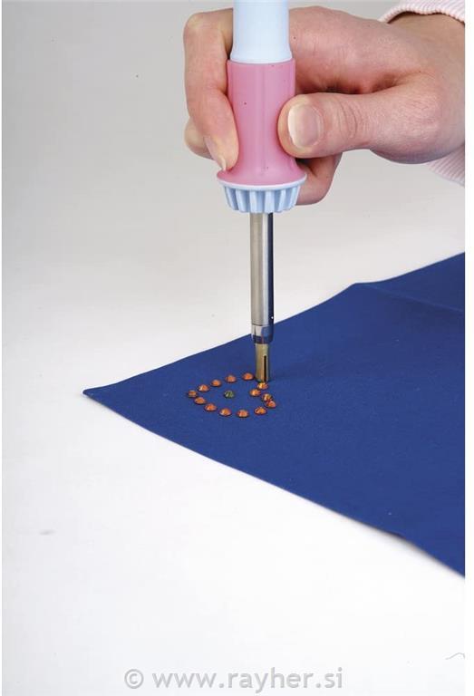Naprava, aplikator za pritrjevanje okrasnih kamenčkov in netov na tkanino, usnje, keramiko, papir in les.