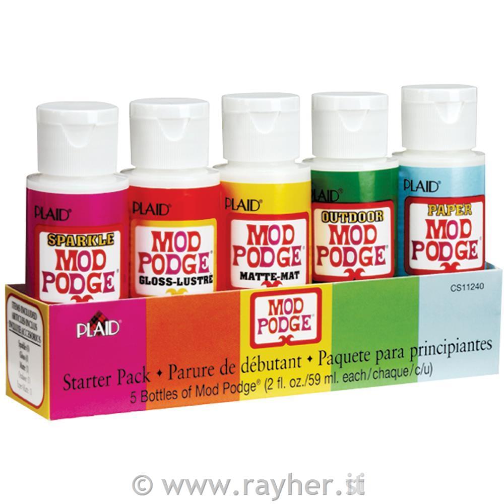 Una splendida collezione di vernici e colle Mod Podge in un unico prodotto per le tecniche di decoupage - il set comprende cinque flaconi da 59 ml di medium - glitter, opaco e glitter, medium per carta e medium per esterni.