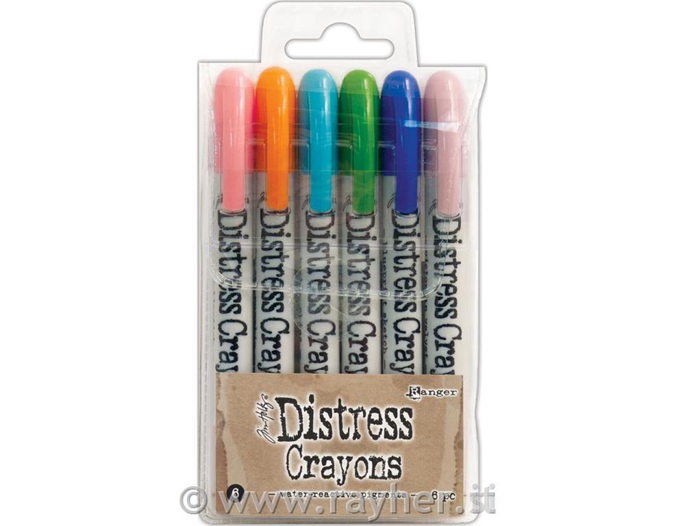 Distress Crayon voščenke so vodotopne, zelo mazljive ter močno pigmentirane. Uporabljajo se direktno na papir, kjer jih lahko razmažemo, med seboj mešamo ali kombiniramo s vodo in drugimi mediji. Idealne za barvanje odtisov štampiljk, izdelavo ozadij s šablonami, kombinacijo z vodo, za mix media tehnike...