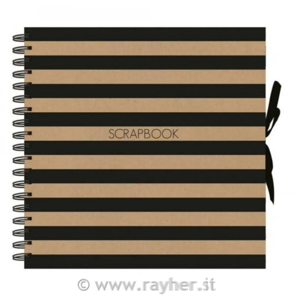 Elegantni in sodobni scrapbook fotoalbum v kombinaciji naravnega kraft kartona in črnih vodoravnih črt izstopa s svojim minimalističnim, a izrazitim dizajnom. Spiralna vezava omogoča enostavno listanje, dekorativni trak na desni strani pa poskrbi za estetsko in stabilno zapiranje albuma.