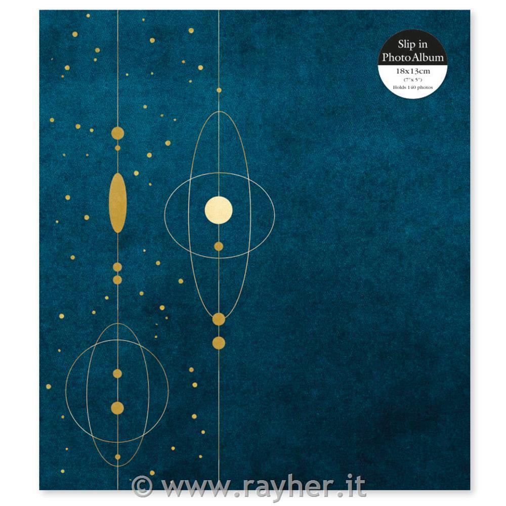Elegantni fotoalbum v globoki petrolej modri barvi, okrašen z modernim zlatim geometrijskim vzorcem. Luksuzen videz in minimalistični detajli ga naredijo popoln za shranjevanje najlepših spominov. Album je namenjen vstavljanju fotografij in sprejme do 140 fotografij velikosti 13×18 cm. Idealno kot darilo ali za urejeno domačo zbirko.