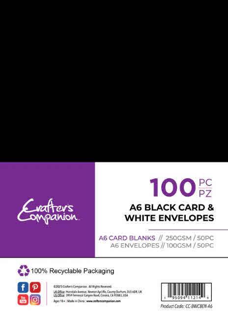 V paketu Crafter's Companion A6 so črne osnove za voščilnice in bele kuverte - 100 kosov