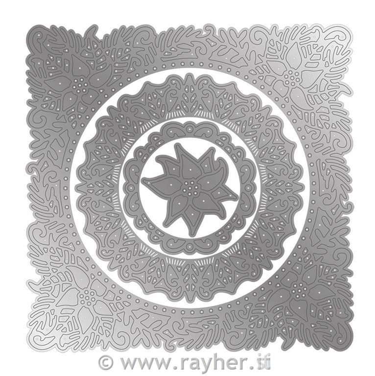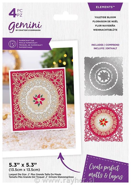 Komplet Yuletide Bloom vsebuje štiri rezalne šablone, ki so obrobljene z zapletenimi izsekovalnimi vzorci za ustvarjanje zapletenega cvetličnega vzorca. Zunanja, kvadratno oblikovana rezalna šablona vsebuje nežne božične cvetove in listje, najmanjša pa božično zvezdo.