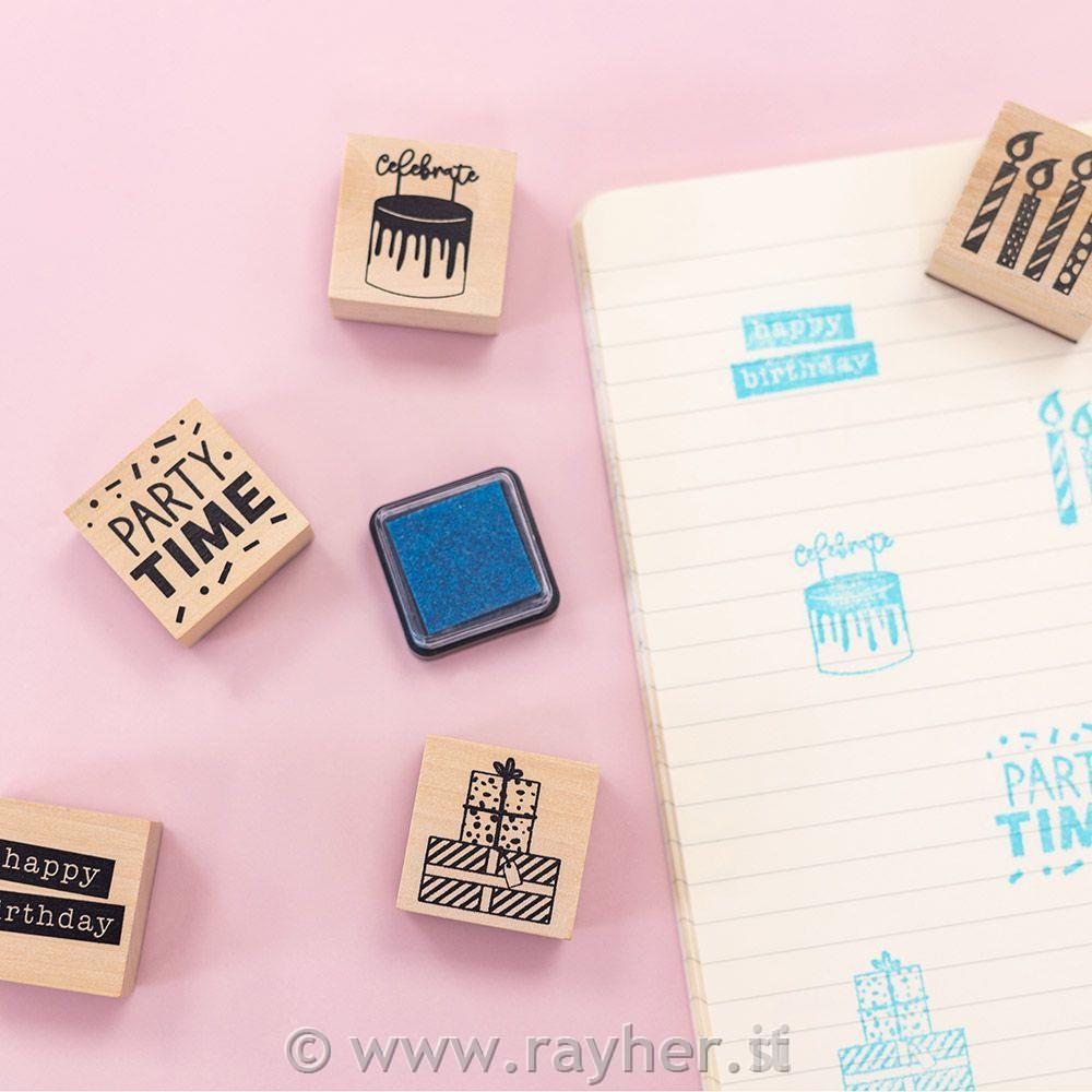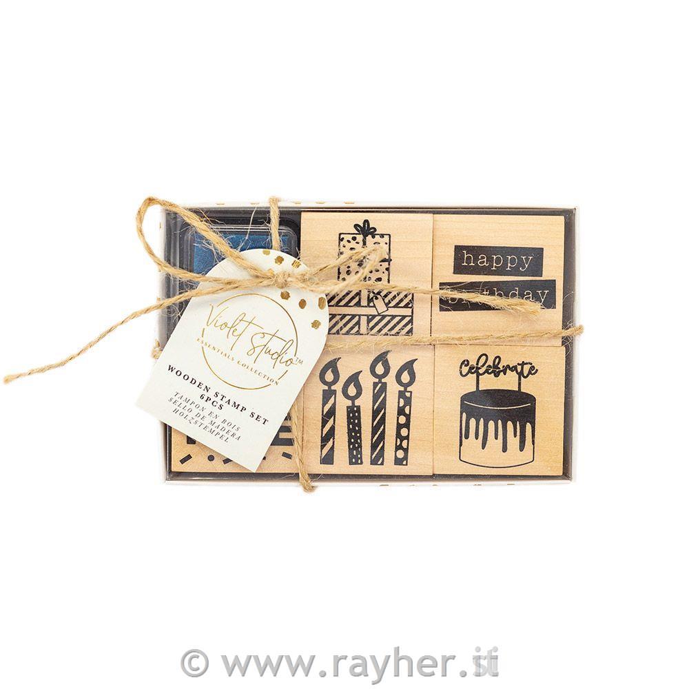 Komplet štampiljk Violet Studio Party vsebuje 5 štampiljk na lesenih držalih za ustvarjanje številnih zabavnih prazničnih vzorcev, vključno z darili, svečkami, torto in napisom "Vse najboljše za rojstni dan". Setu je priložena tudi modra blazinica za štampiljke. Set je lahko tudi lepo darilo.