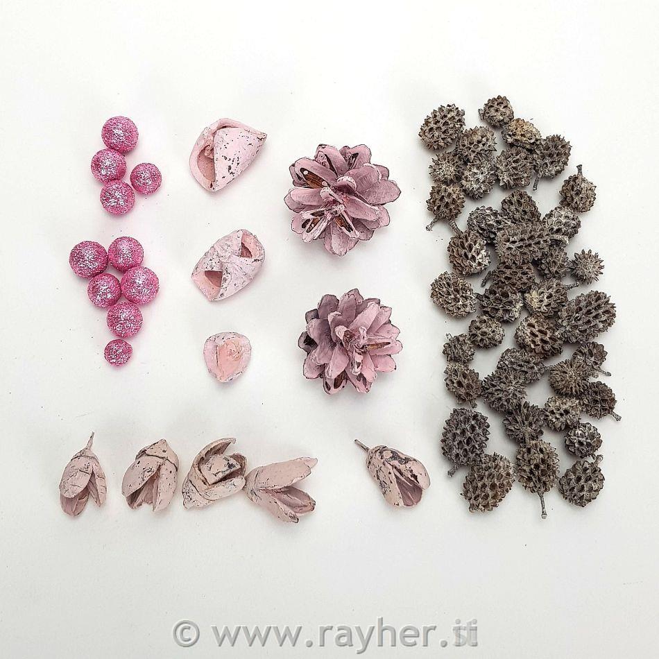 V setu so različni izdelki za krasitev; storžki, zasnežena vejica, bunkice, lubje,.... Izdelke lahko uporabite pri različnih dekoracijah.