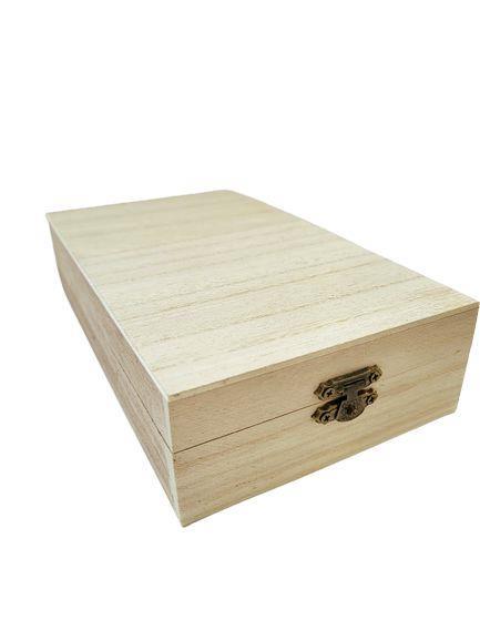 Notranje mere lesene škatle so 10,7x18,5x2.8 cm.